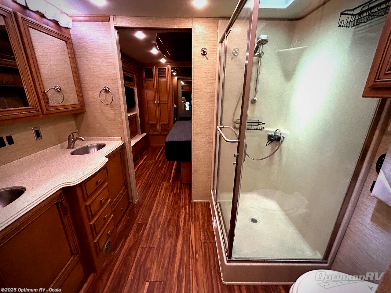 The walk-thru bathroom has a sliding doors on either side to separate the living space from the bathroom and the bedroom from the bathroom. Here you will find a toilet, overhead cabinet, and a 40"x32" shower along the road side. On the opposite side of the motor home there is a linen cabinet, and two sinks!