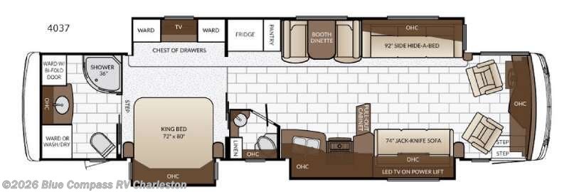 On the opposite side there is a full wall slide stretching from the living/kitchen space to the master bedroom. The slide out features a 92" side hide-a-bed sofa, overhead storage, booth dinette, pantry, refrigerator, dual wardrobes, chest of drawers, and a bedroom TV. The driver and passenger's chairs rotate to provide more seating in the living space.