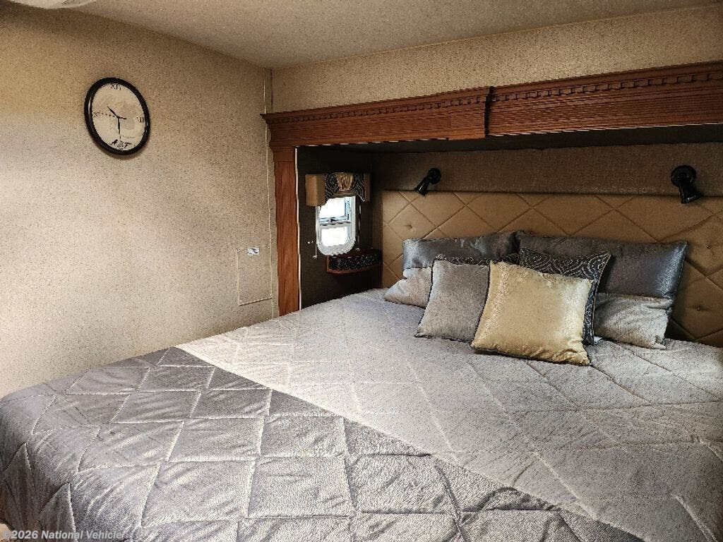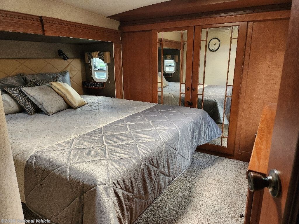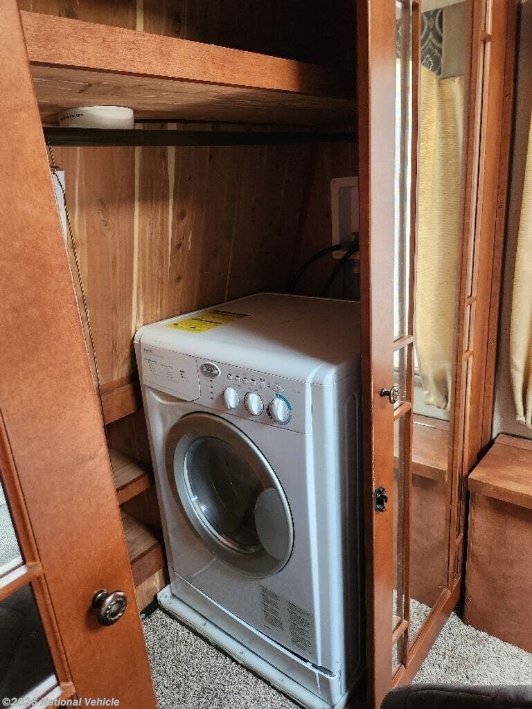 The bedroom includes a king bed slide out. The front wall provides a sliding mirror wardrobe, and a washer/dryer. There is also a TV mounted in this corner and a dresser on the wall opposite the bed.