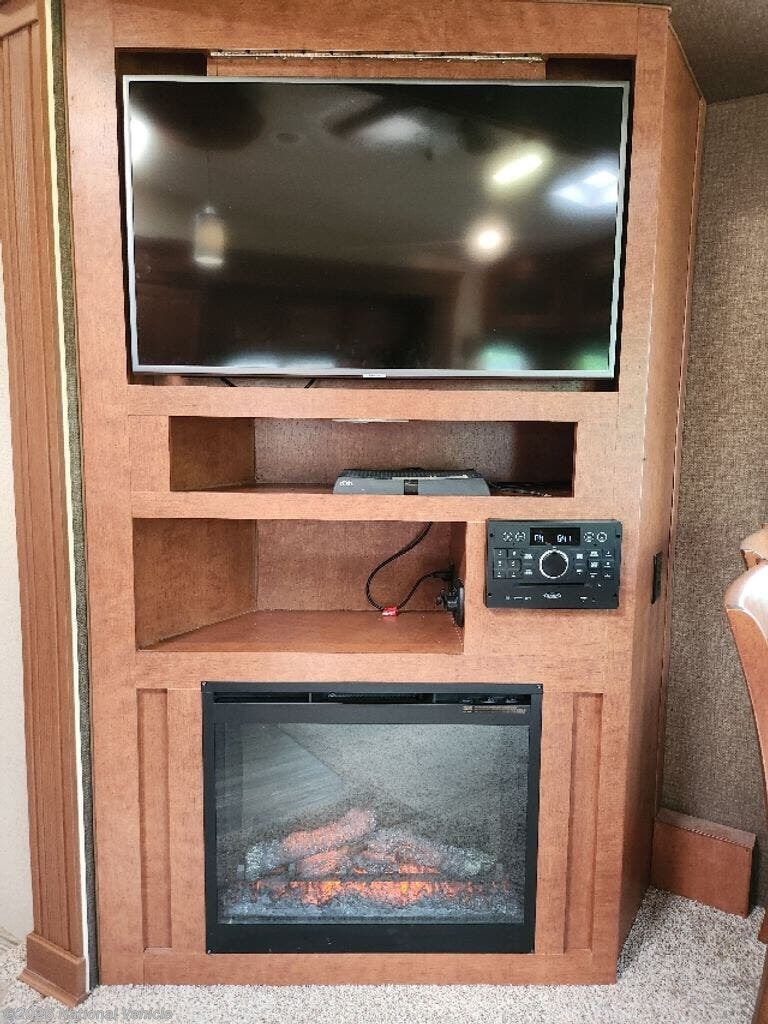 In the living area, the room is spacious with two slide outs opposite each other. To the left of the entry door, a generous slide includes an entertainment center with a fireplace below, a TV, overhead cabinets, and a free-standing dinette with four chairs.
