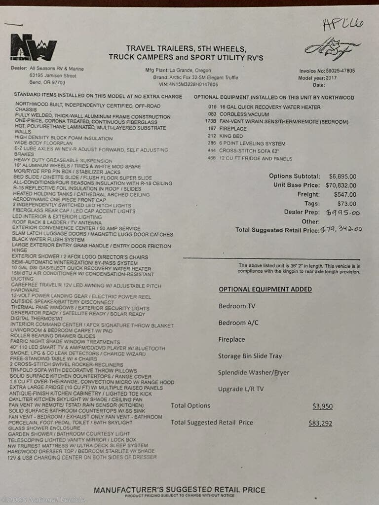 Request More Info on this 2017 Northwood Arctic Fox 32-5M Offered for sale by National Vehicle