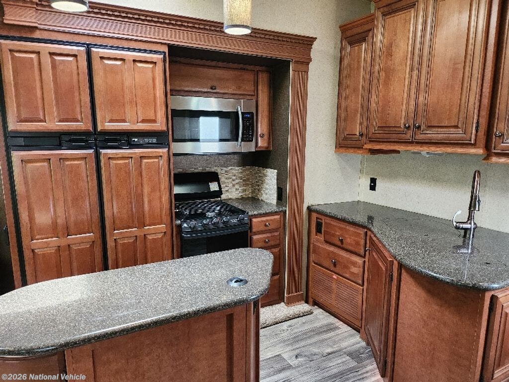 Continuing around, another slide includes theater seating with overhead cabinets and the beginning of the kitchen with a refrigerator, a three-burner range, counters, and overhead cabinets. The kitchen continues along the interior wall with additional countertop space, overhead cabinets along the wall and an angled double kitchen sink with a L-shaped countertop, also enjoy extra work space with the island.