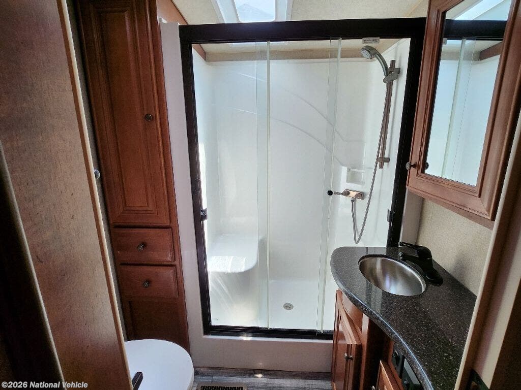 As you enter at the center of the 32-5M, you go up two steps on your right to the master bed and bath. A full bathroom to the left includes a toilet, a shower, a vanity sink, a medicine cabinet, shelves, and private entry to the bedroom.