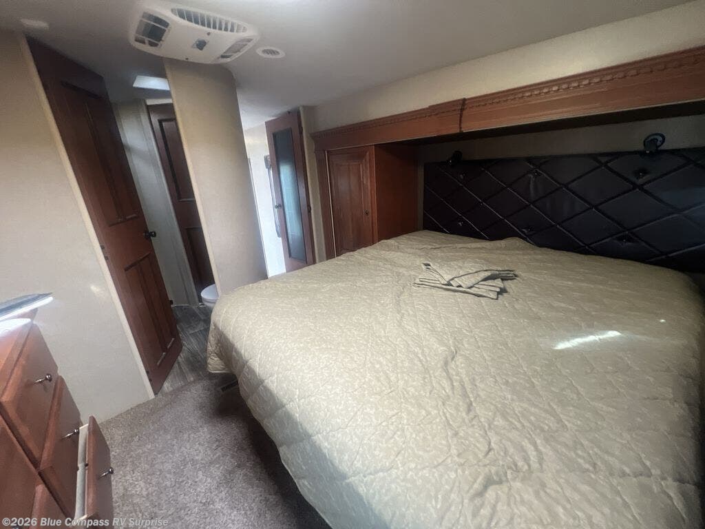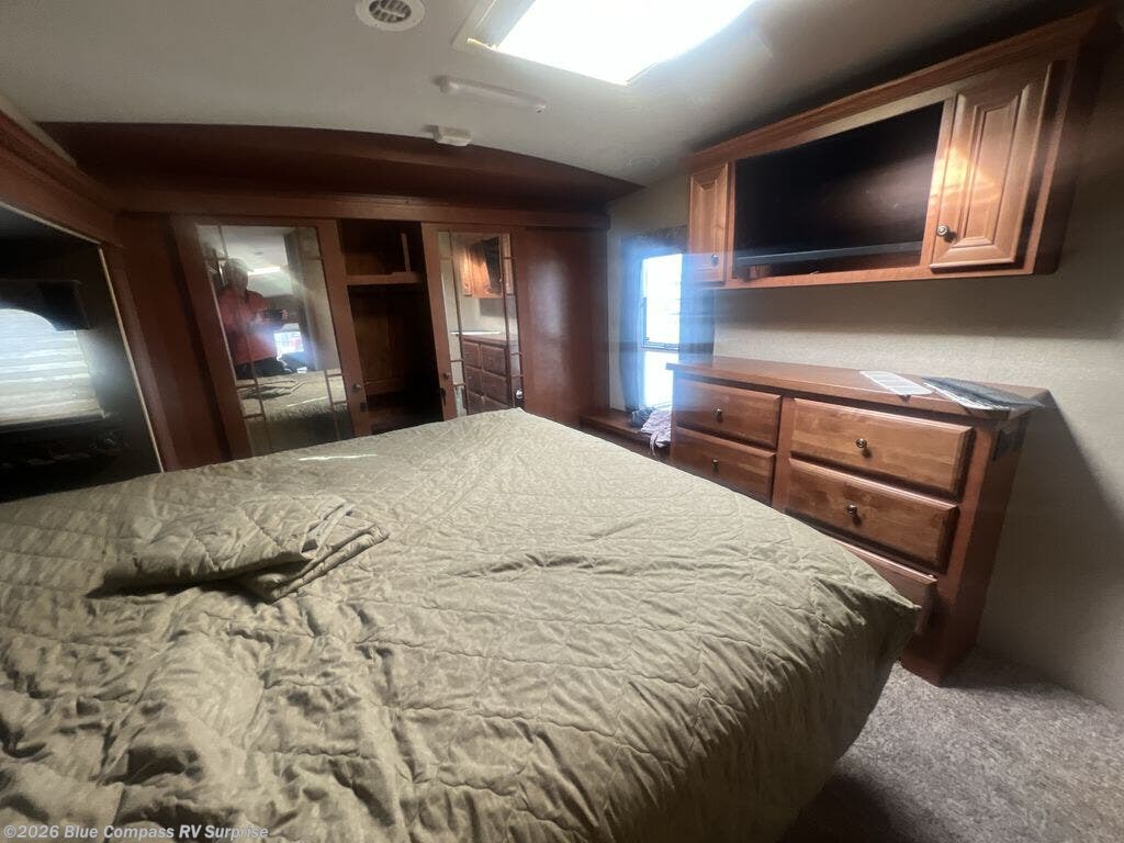 The front private bedroom includes a slide with a wardrobe, a queen bed and nightstands. You may choose an optional king size bed. There is a dresser on the wall opposite the bed. Along the front wall is a sliding mirror wardrobe and a washer/dryer closet or wardrobe in the corner.