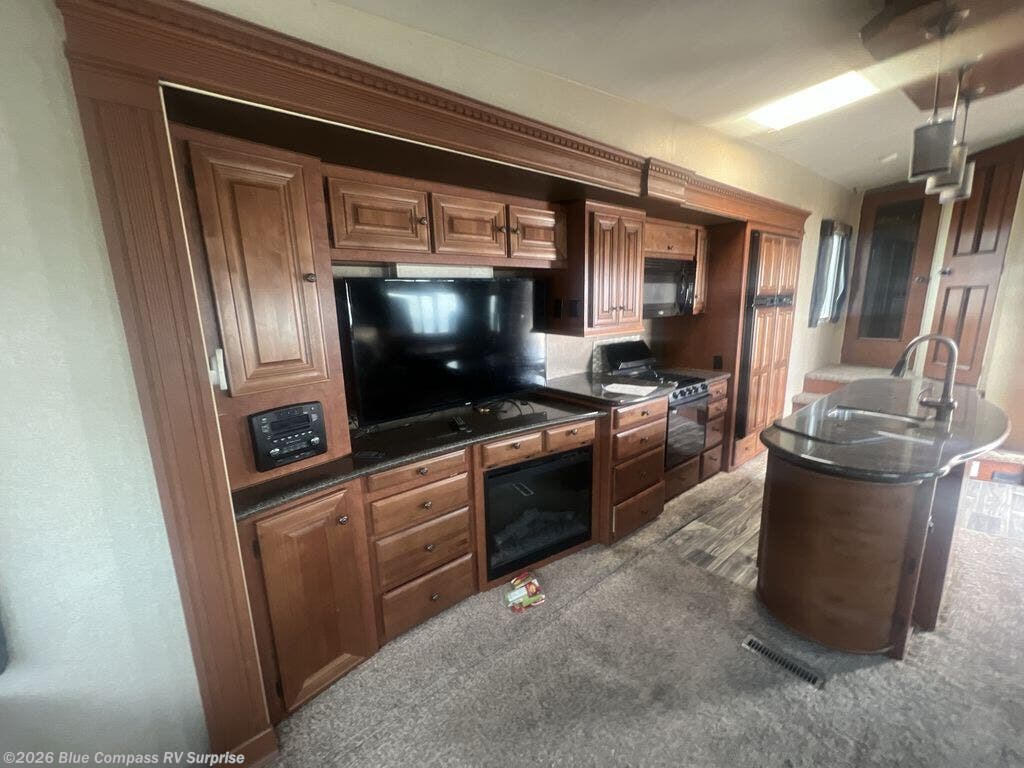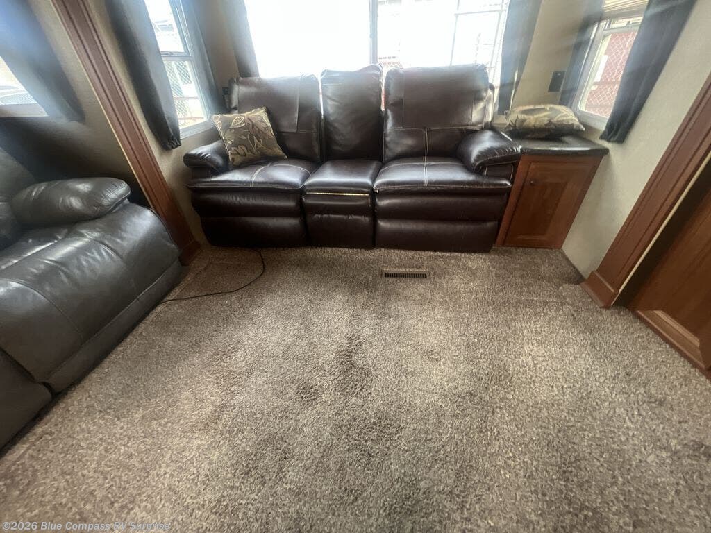 As you step into this fifth wheel, there is wide open floor space with two slide outs opposite each other in the living/kitchen area. Immediately to the right is a coat closet. To the left of entry, a slide provides a free standing dinette with four chairs, two swivel chairs and overhead cabinets.