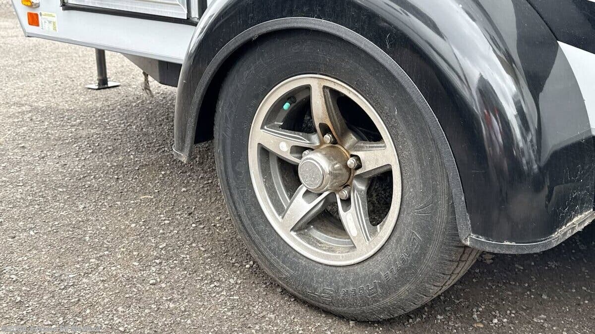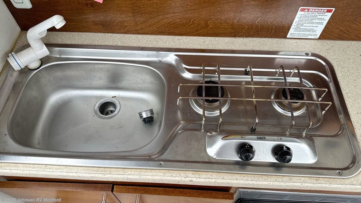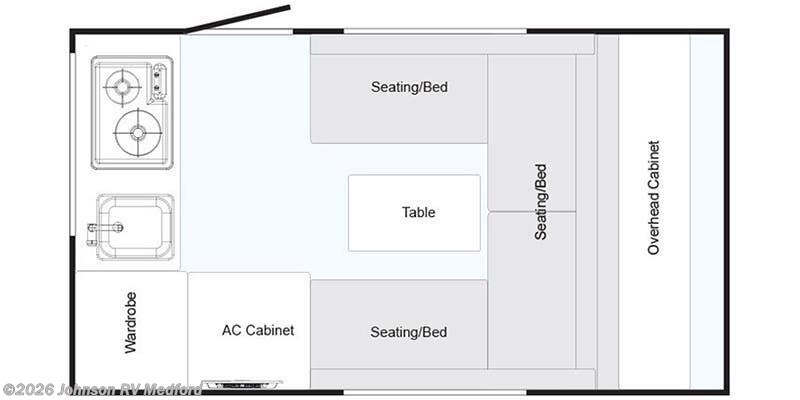 Features Include: Fantastic Fan, Dinette Table (vbm), Stainless Steel Sink, Refrigerator, Aluminum Framed, Composite Sidewalls, Fiberglass Exterior, Custom Alloy Wheels, Lit Entry Handle, Upscale Cabinetry, White Countertops, Pitched Axle, Yakima Roof Rack, Cargo Basket, Spare Tire, Marmoleum Flooring, Solid Gray Cushions, Cargo Netting