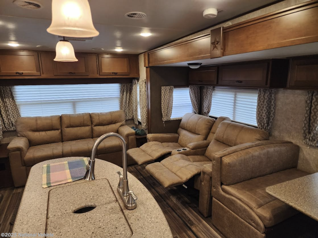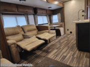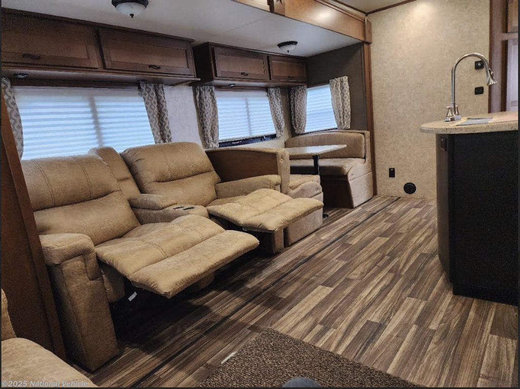 Step inside to a welcoming interior highlighted by a rear living area featuring dual recliners, a tri-fold sleeper sofa, and an entertainment center?ideal for relaxing after a day of exploring. The open-concept kitchen offers solid-surface countertops, a three-burner cooktop, oven, microwave, a refrigerator, pantry, and a dinette for comfortable dining and gathering.