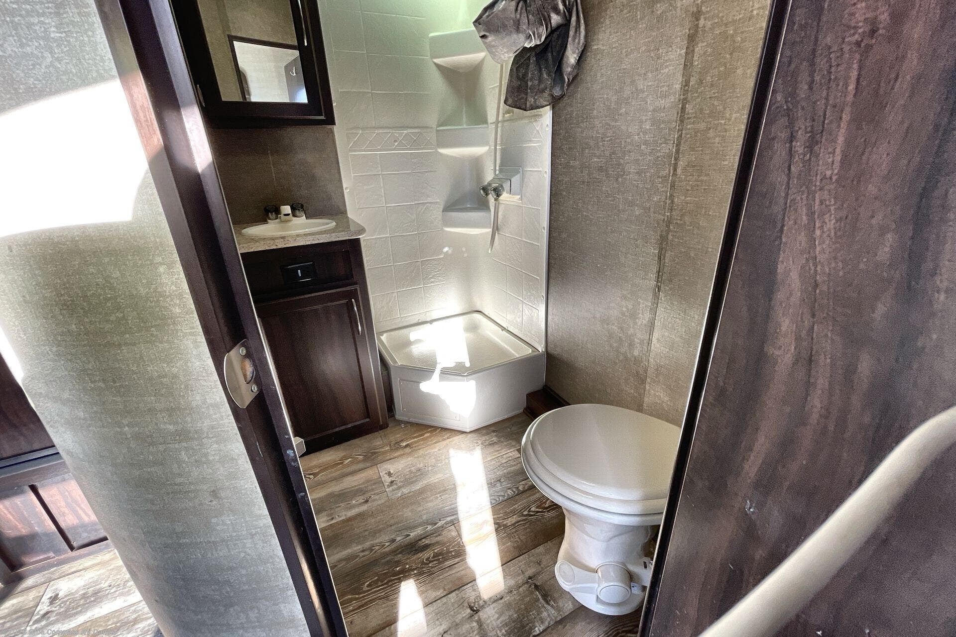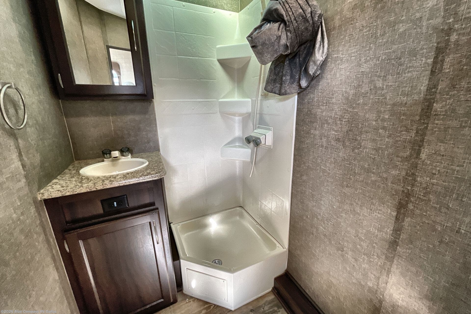 As you step inside 21FS to the right is a bedroom that includes a 54" by 80" size bed, a wardrobe closet at the foot of the bed, and overhead cabinets along the front and side wall. The side aisle bath is just inside the entry door and next to the bedroom. The bathroom has an angled corner shower and toilet, and a sink.