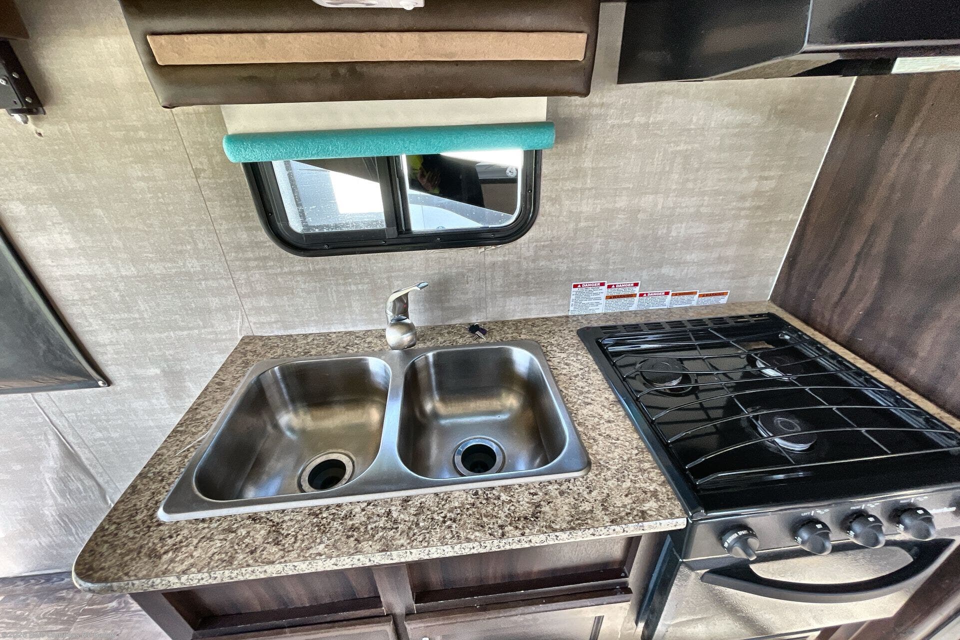 The kitchen area includes a refrigerator, a three burner range with optional microwave above, and a double kitchen sink with overhead storage. Overhead cabinets are just across from this area. There are dual sofas that fold down for sleeping space with pedestal tables when it's time to eat or play games. Additional sleeping space is available on the optional drop down electric bed.