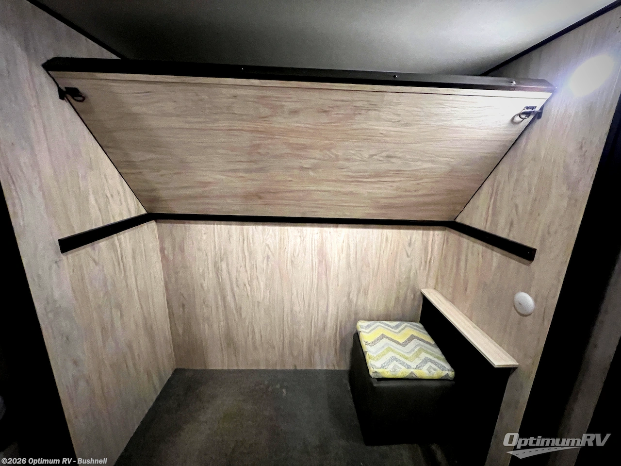 Head towards the rear and you will come to the bunk house. Here there is a slide out along the road side which features a 68" tri-fold sofa beneath a flip-up bunk above. Along the rear wall there is a L-shaped loft bed above the same size bunk below. Across from the slide out there is also a small dresser beneath the L-bunk above. Near the entry door you will find a beautiful frosted glass panel.