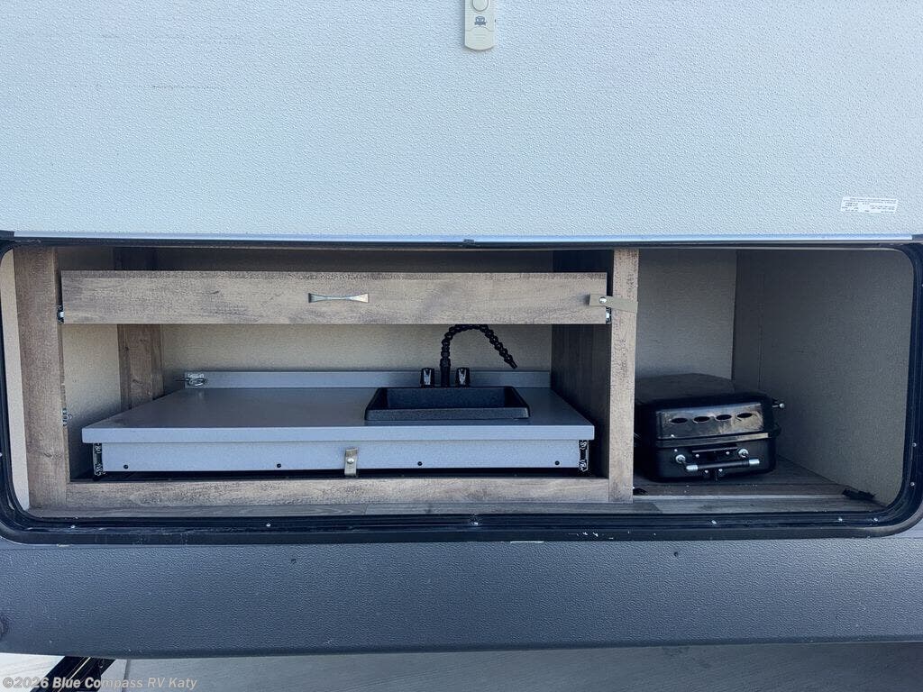 Outside you are sure to enjoy the mini camp kitchen option including a pull-out drawer with sink above and a mini-refrigerator near the rear of the trailer, plus much more!