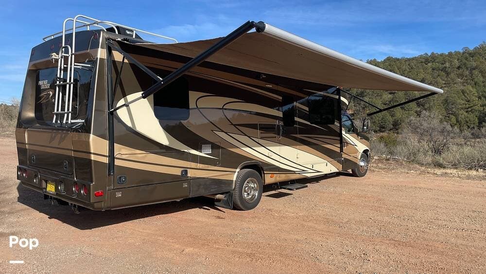 On the exterior, this RV features Phoenix signature molded fiberglass body with clean, aerodynamic lines, premium paint and graphics, and a high-gloss finish that stands out while remaining timeless. Large tinted windows allow natural light inside while maintaining privacy, and exterior storage compartments are thoughtfully placed for easy access to gear and travel essentials. An integrated awning expands the living space outdoors, creating the perfect setup for relaxing at campsites.