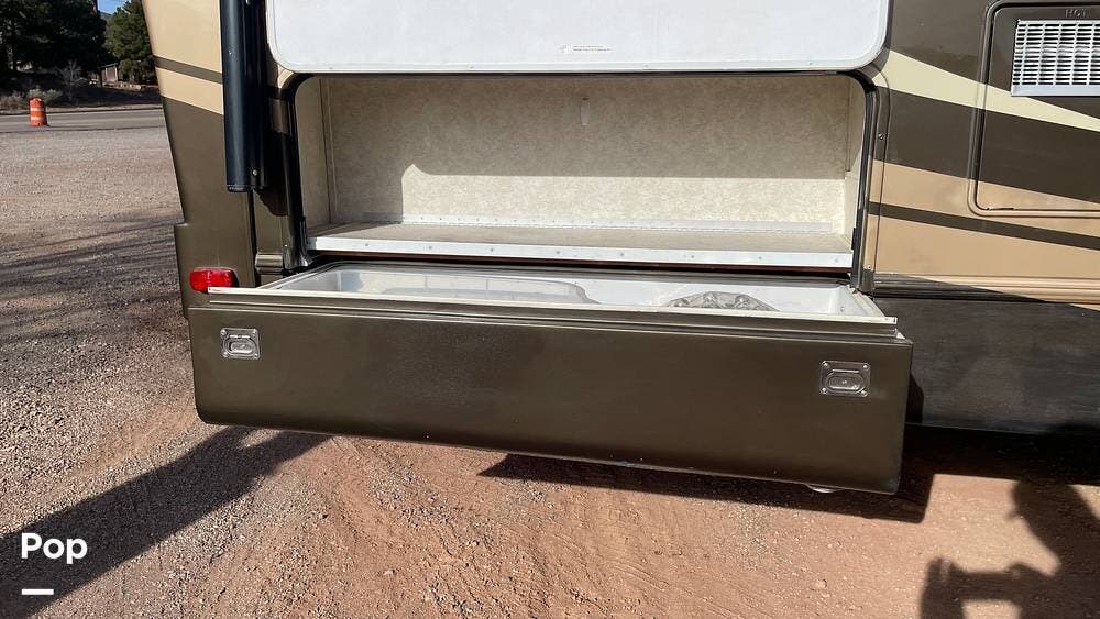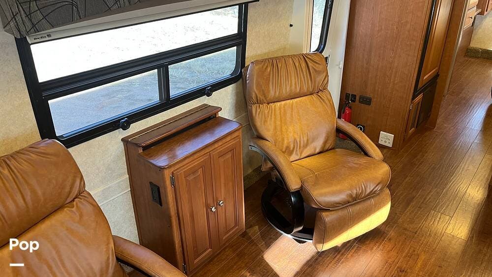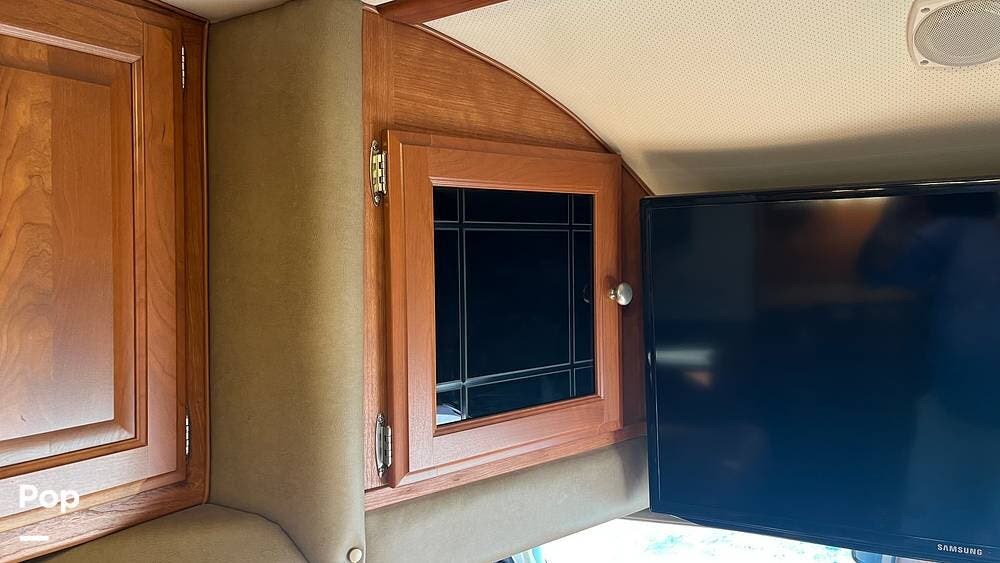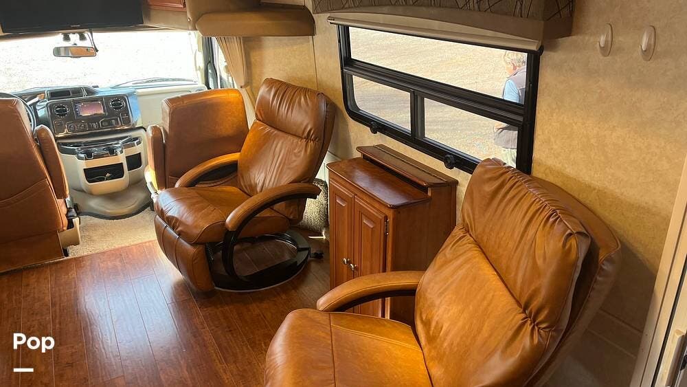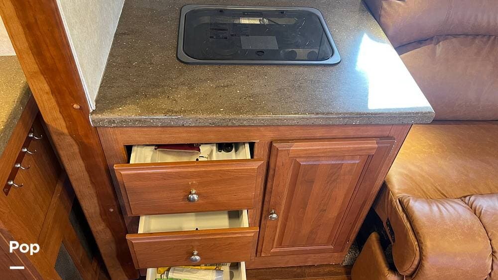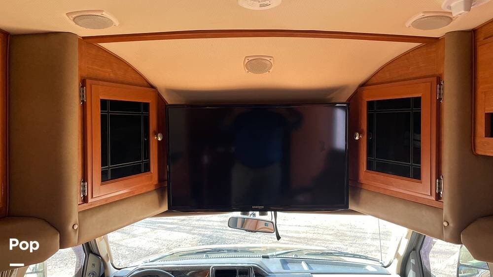 Inside, the living area immediately reflects Phoenix USA's reputation for quality and attention to detail. Rich hardwood cabinetry, solid surface countertops, and plush seating create a warm, residential feel. The main lounge area offers comfortable seating for relaxing, reading, or entertaining, with well-positioned windows that provide excellent views and natural light. The layout feels open and spacious, making it ideal for both short getaways and extended trips.