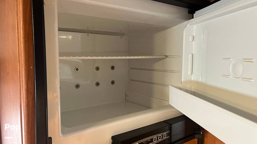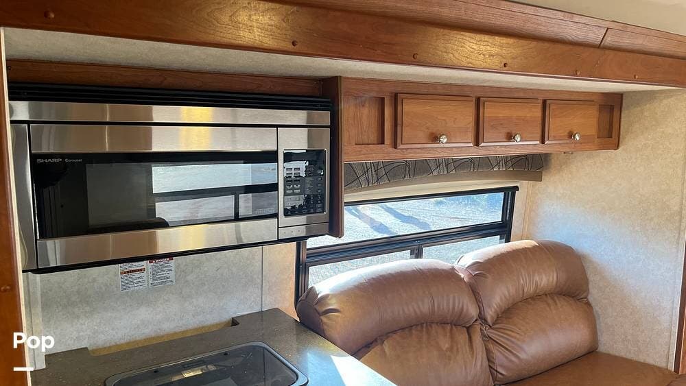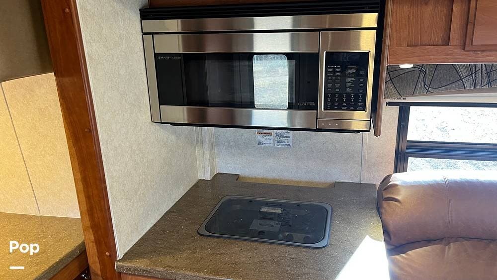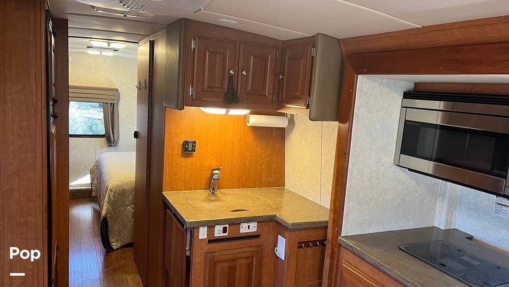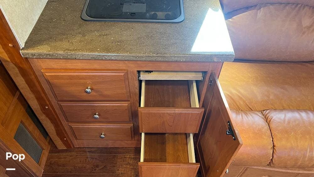 The kitchen is efficiently designed yet upscale, offering everything needed to prepare meals on the road. It includes generous counter space, a quality cooktop, microwave, and refrigerator, all surrounded by beautifully crafted cabinetry for organized storage. Thoughtful lighting and ventilation make cooking comfortable, while the layout keeps everything within easy reach.