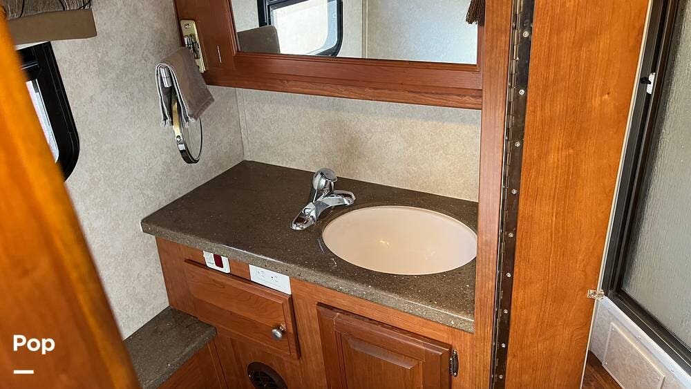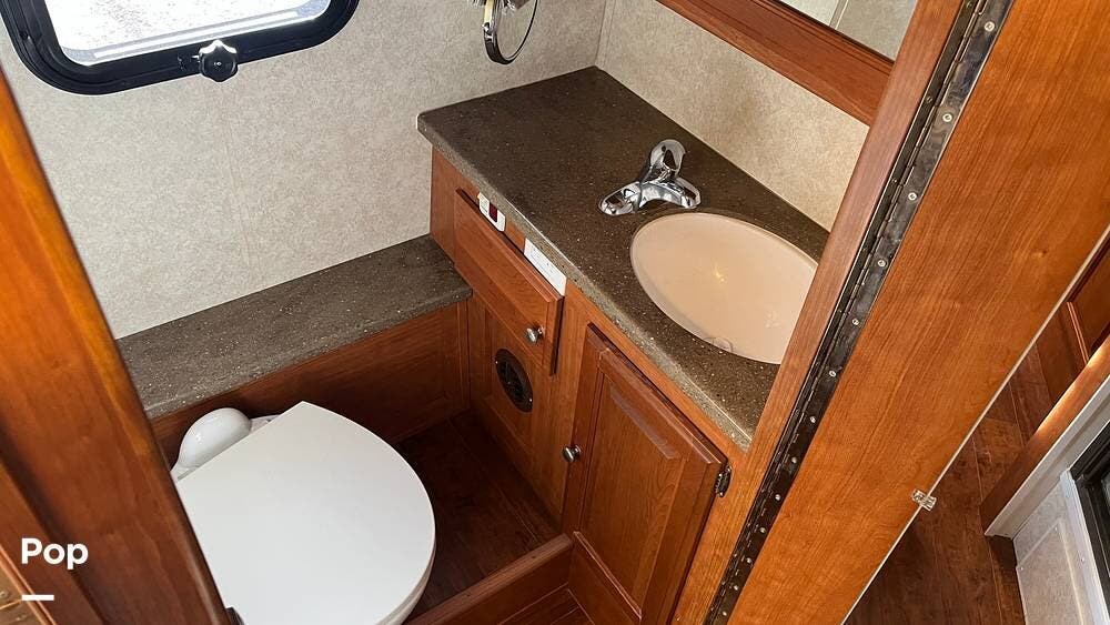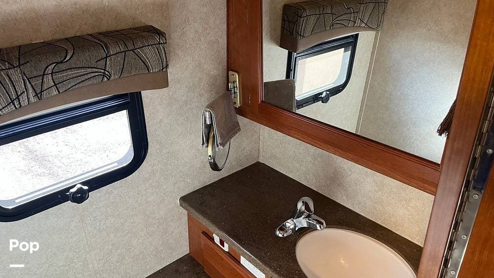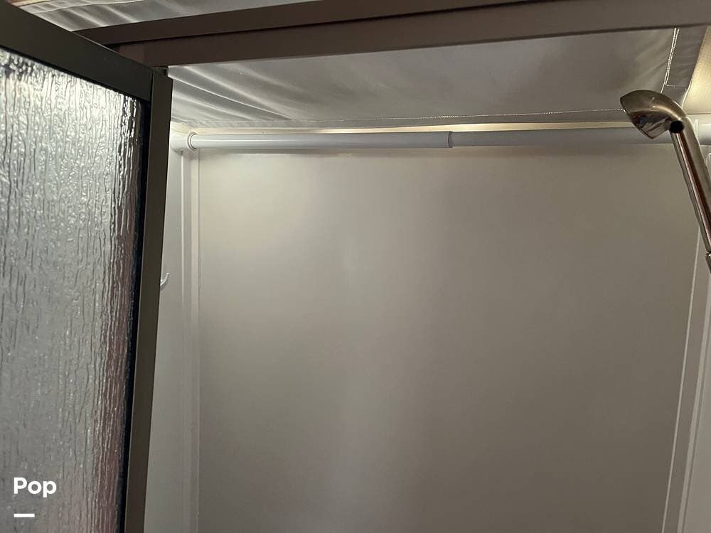 The bathroom is elegantly finished and surprisingly spacious, offering a fully enclosed shower, vanity with sink, mirrored medicine cabinet, and additional storage. High-quality fixtures and smart design make the space functional and comfortable, whether you're stopping for a quick refresh or settling in for the evening.