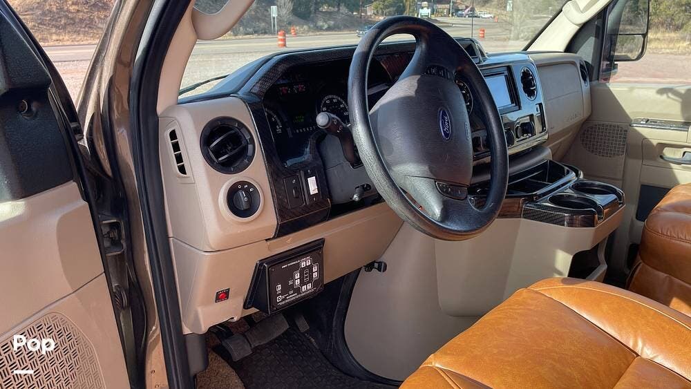 Built on the proven Ford E-Series chassis and powered by the dependable Ford V10 Triton gasoline engine, this coach delivers strong acceleration, smooth highway cruising, and reliable towing capability. The wide-track stance and carefully balanced design provide excellent stability and handling, making long drives comfortable and stress-free.