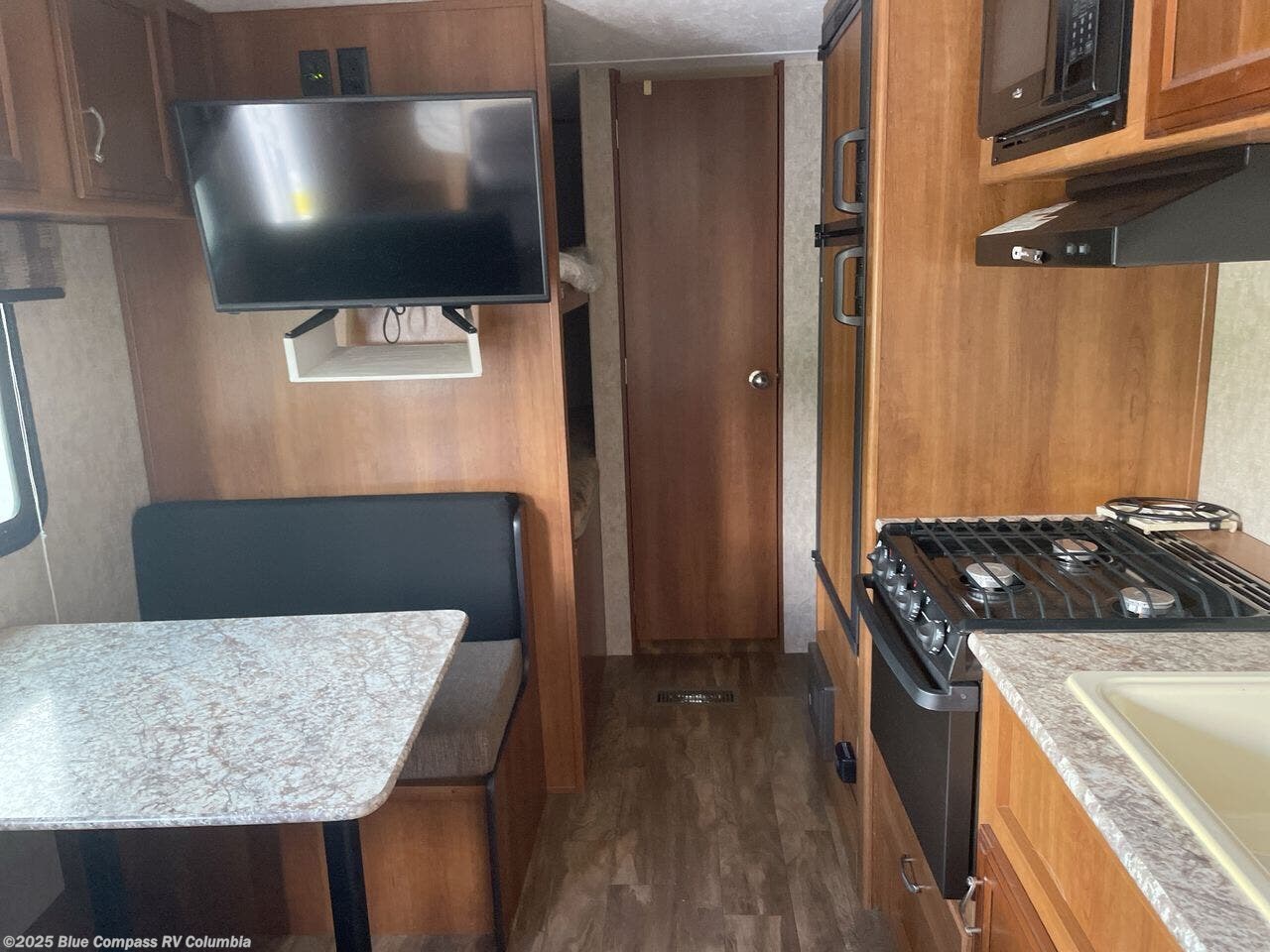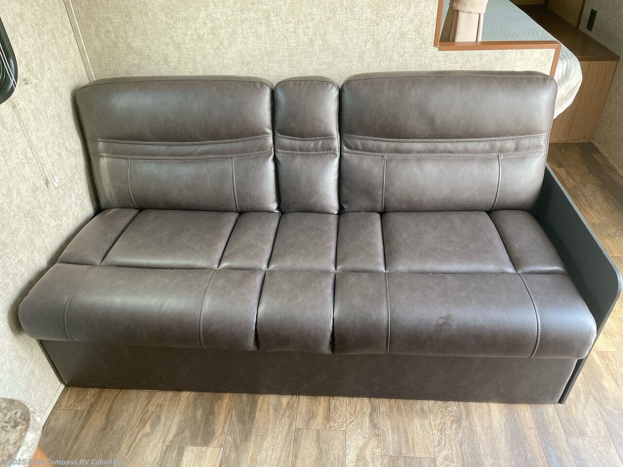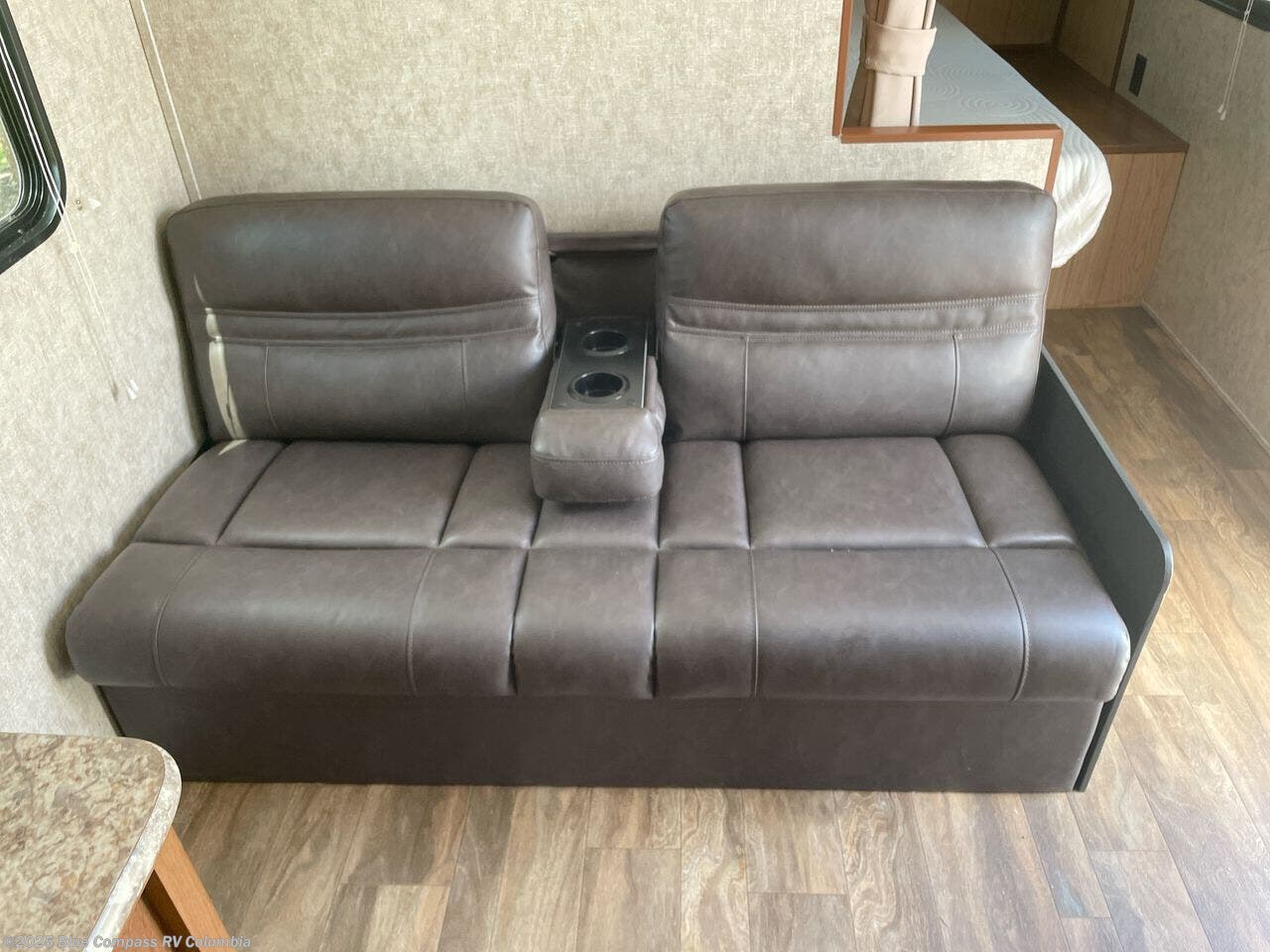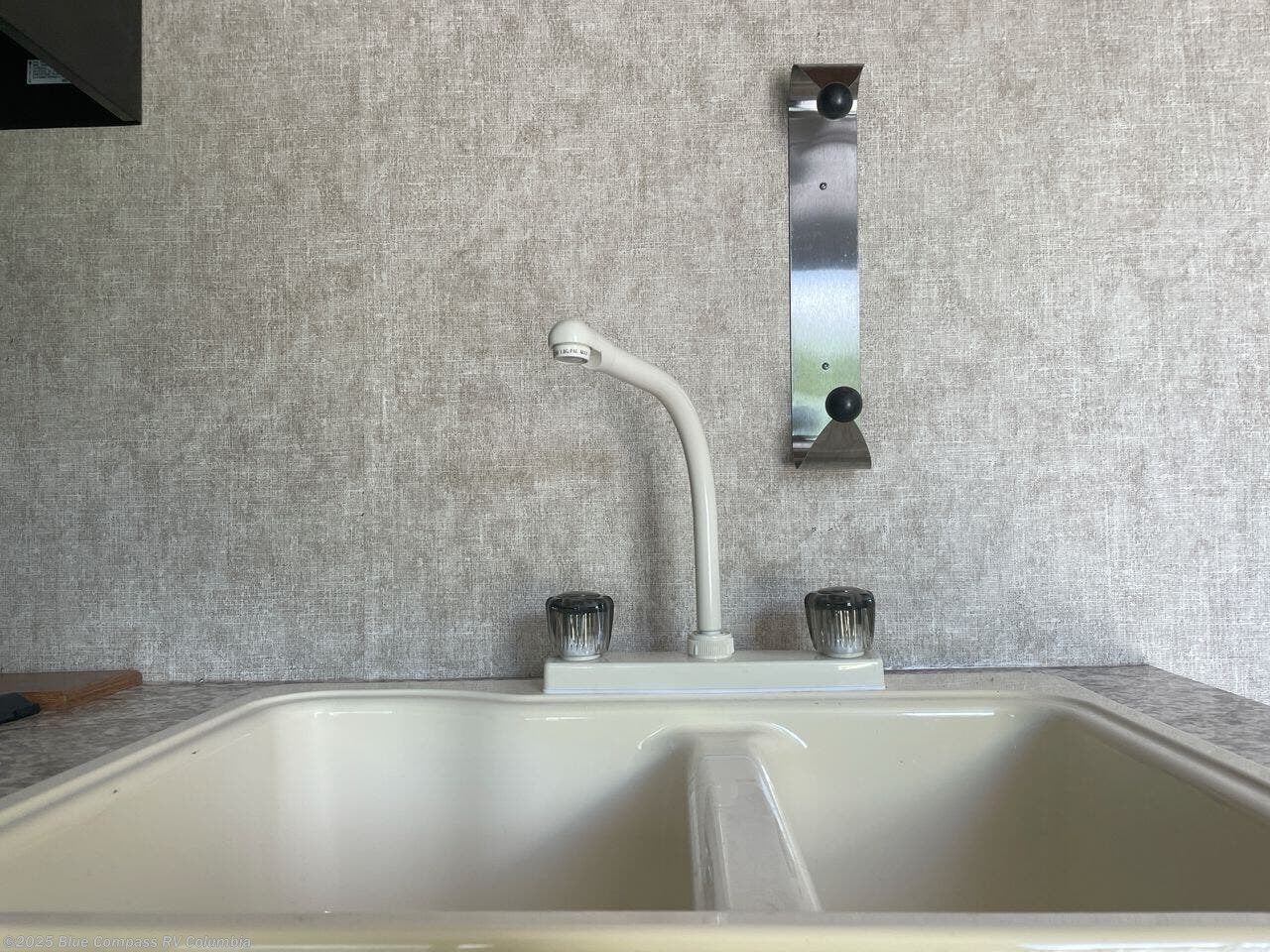 The kitchen and living area offer a sofa, double kitchen sink, three burner range, and refrigerator. The dinette is on the opposite side. You will find a spot for a TV/Radio above the dinette.