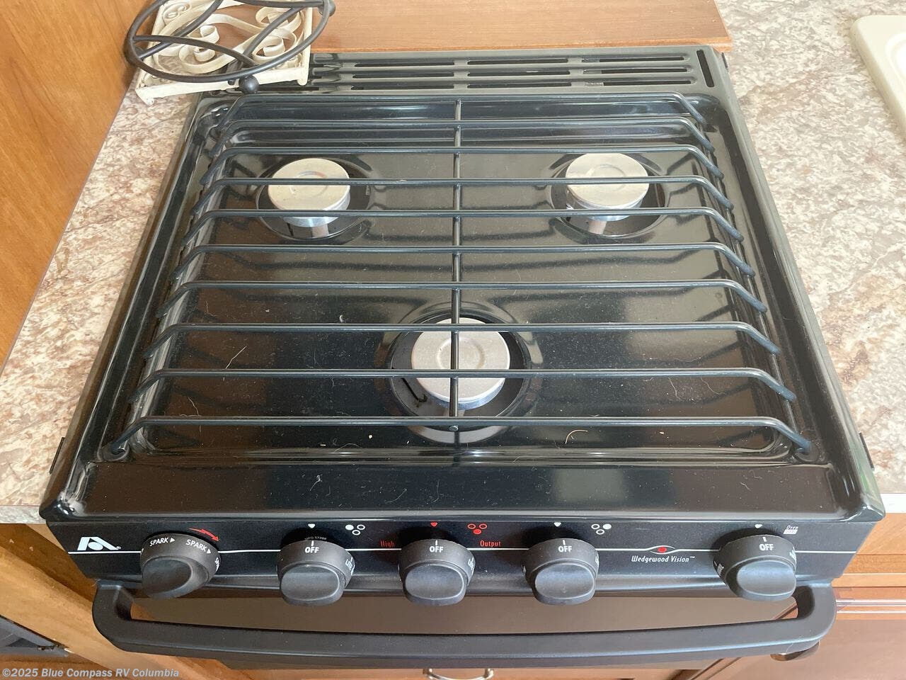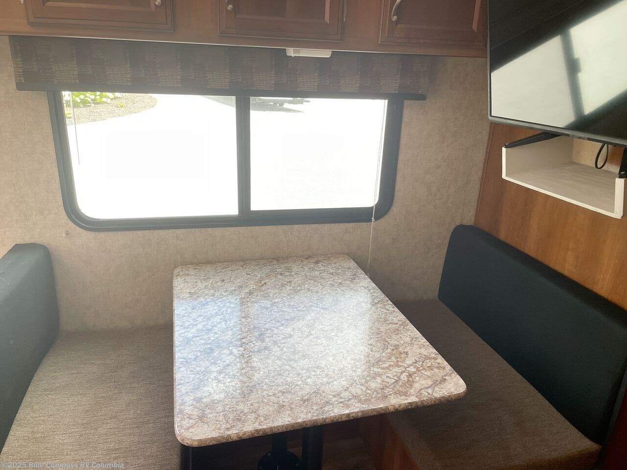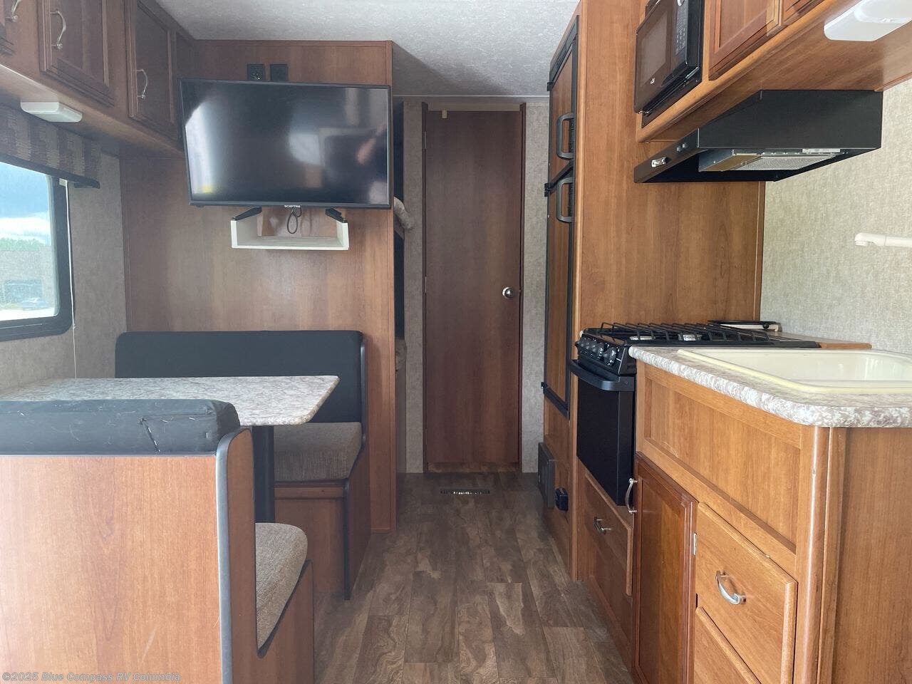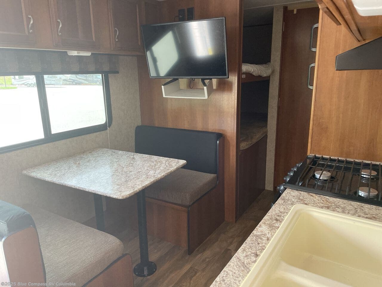 The kitchen and living area offer a sofa, double kitchen sink, three burner range, and refrigerator. The dinette is on the opposite side. You will find a spot for a TV/Radio above the dinette.