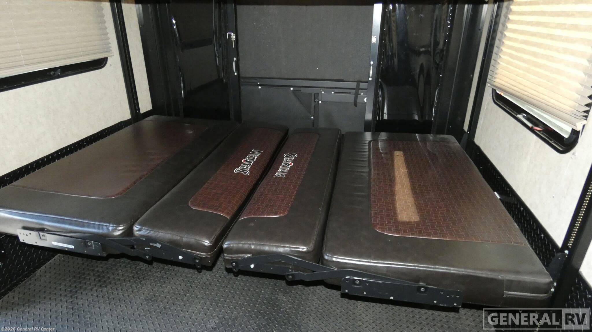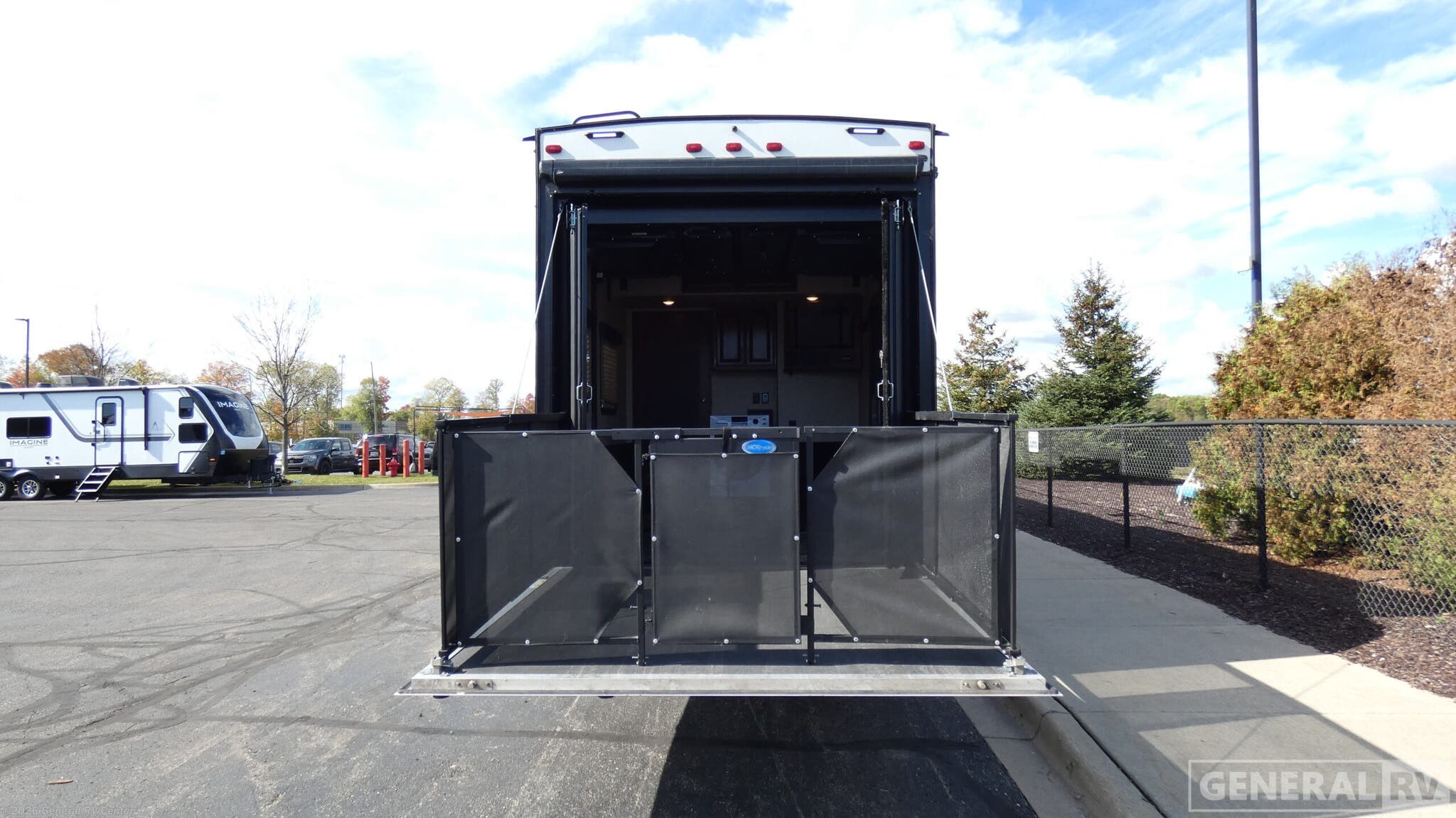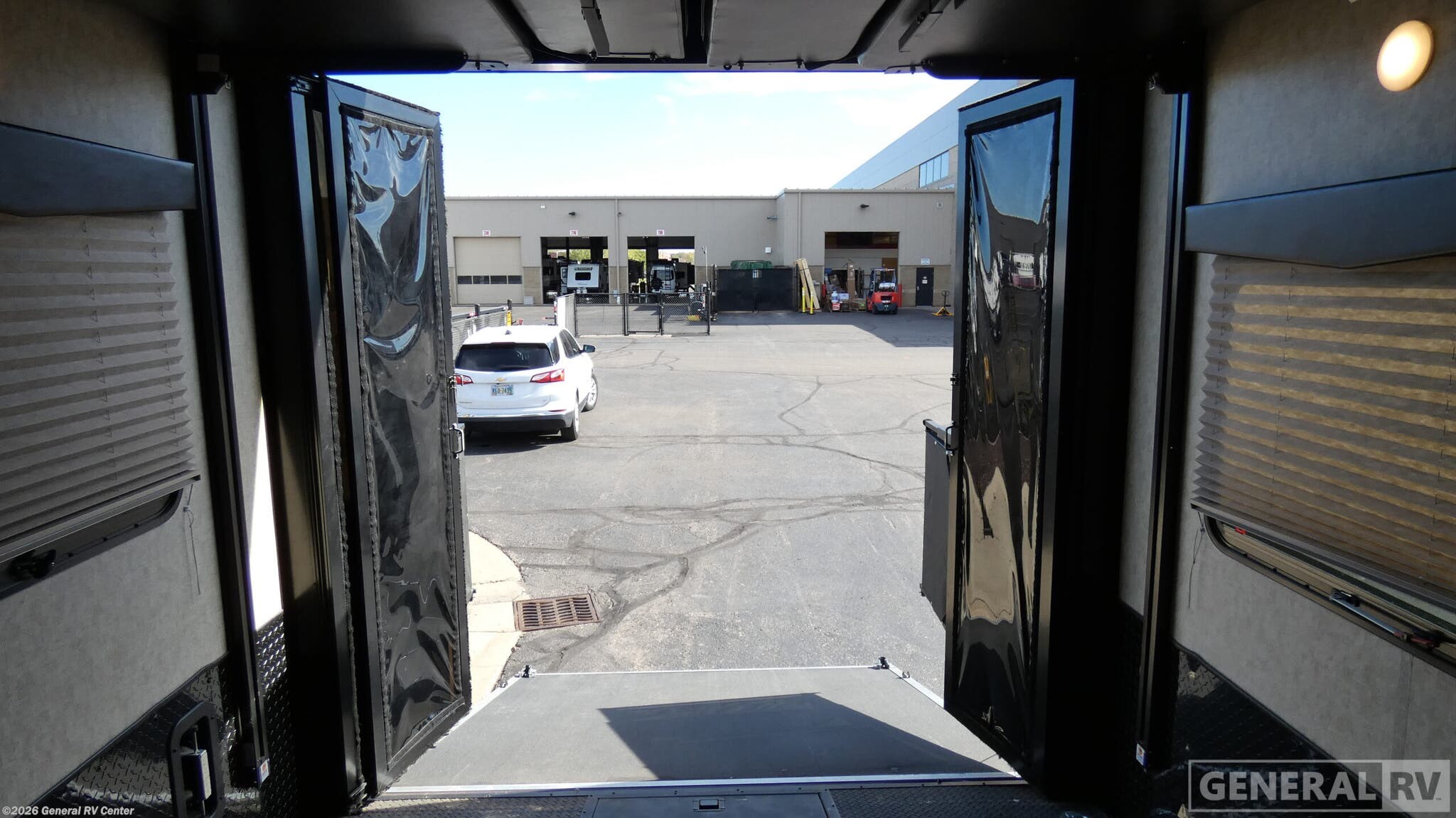 It's time to take your off-road camping trips up a notch in this Prime Time Spartan 1234X model. From the triple slide outs, loft, and dual entry to the 12'6" of garage toy hauling space, this toy hauler fifth wheel provides all the comforts of home! The cargo area offers a ramp door, side man door, and a rear Happijac electric lift system with adult sized bed above and dual folding sofas below. There is even an entertainment center and a loft. You will find plenty of room to store your off-road toys and gear while you are traveling. The main living area has a slide out three-piece reclining sectional sofa and stowable table. Along the interior wall you will find an entertainment center. The kitchen area has a lot of counter space. A large kitchen sink is located on a peninsula surrounded by counter space. Adjacent to the peninsula you will find a pantry for your dry goods. Behind the sink along the curb side wall the chef will enjoy the space in the slide out refrigerator, and cooking on the three burner range. There are two sets of stairs. The first set will lead you into the bathroom. The bathroom has a radius shower, toilet, and sink with overhead storage. There is even a second entry into the bath from the bedroom. The second set of stairs along the road side will take you directly into the bedroom. There is a slide with two closets and a chest of drawers. You will also find a queen bed along the front with plenty of overhead cabinets above the bed. In the corner there is an entertainment center, and more!