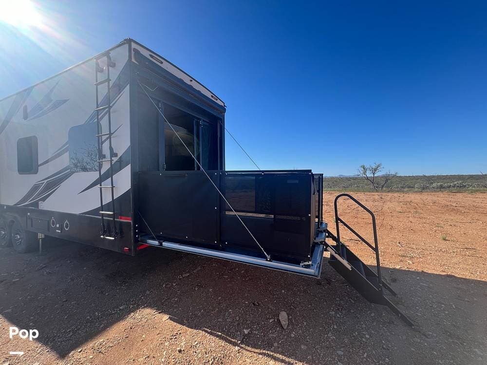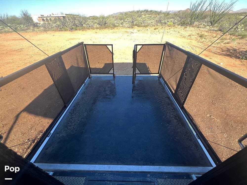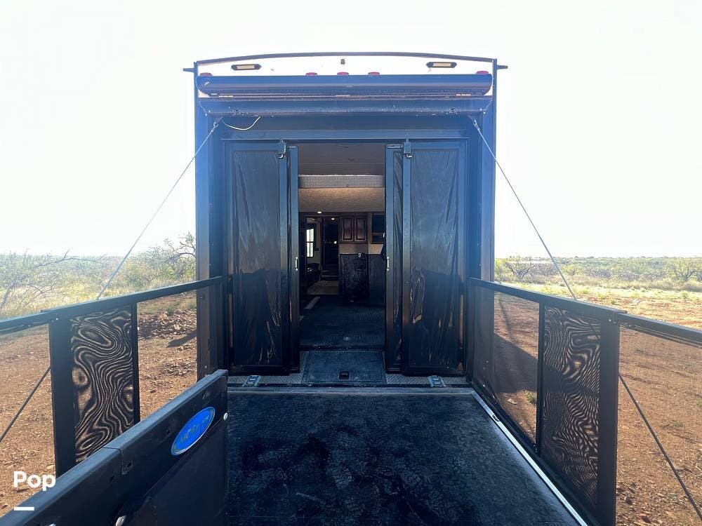 The rear of the unit has a spacious garage. It can accommodate multiple motorcycles or a large UTV. Once the toys are unloaded, the area converts into a sleeping area. The loading ramp turns into a nice fenced patio with an awning--a great place to relax after playing with the toys.