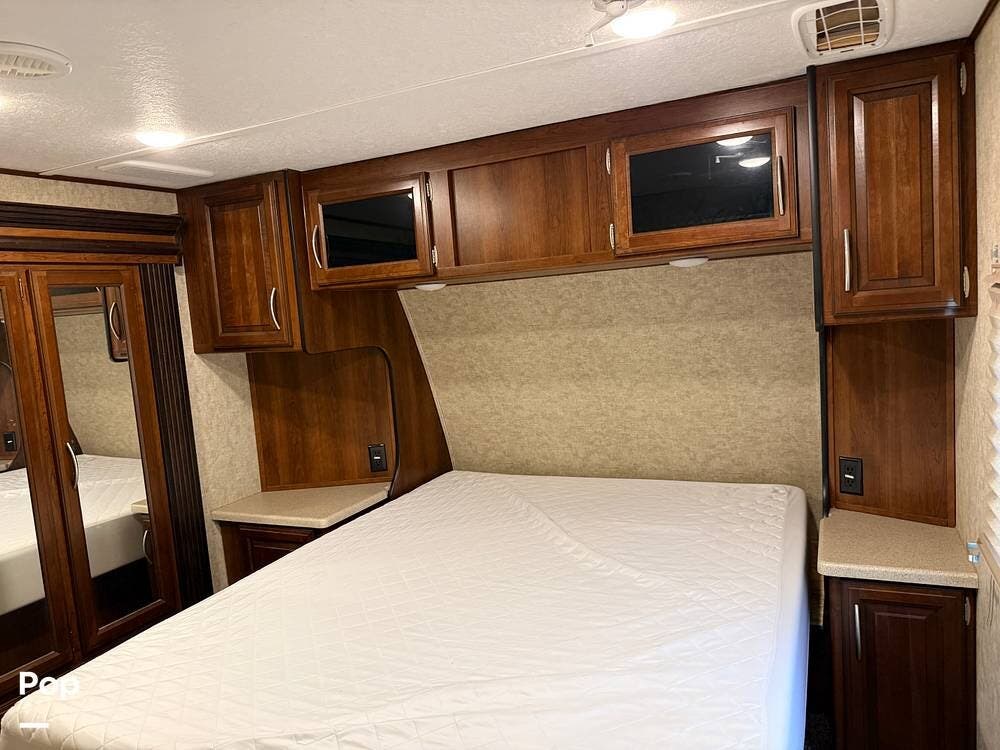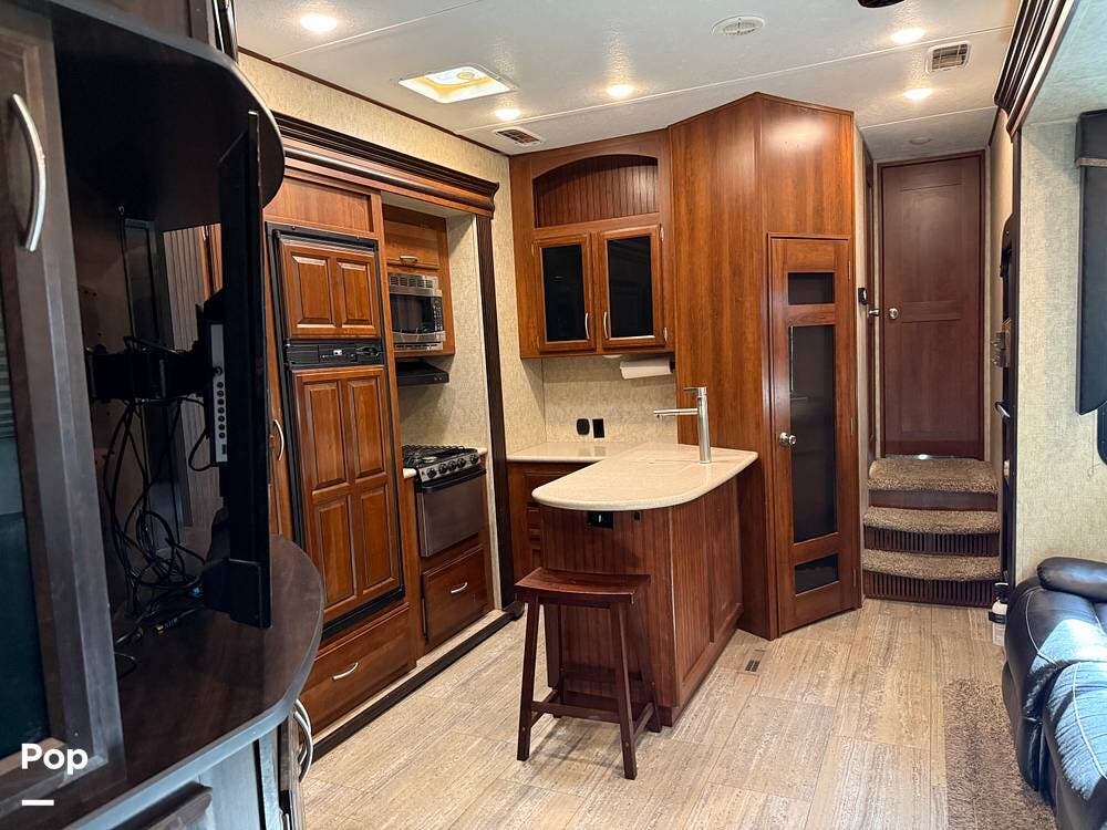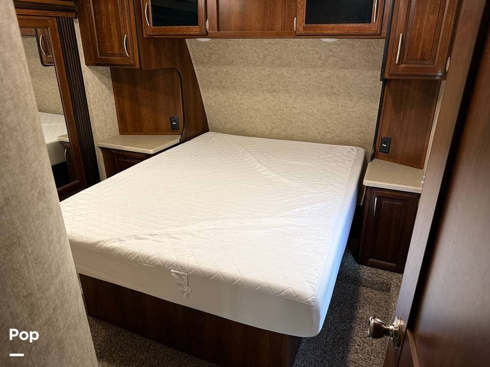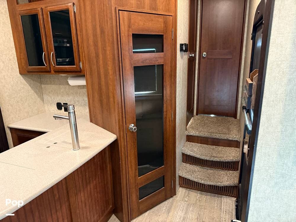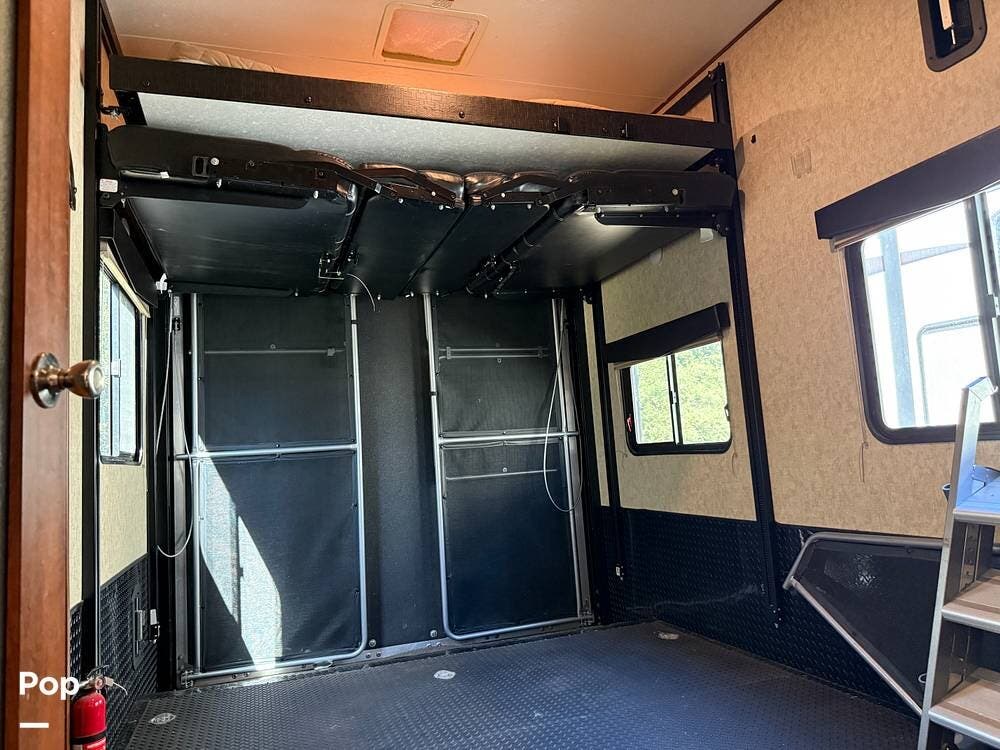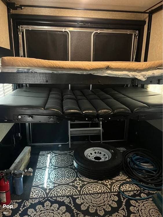 The garage is functional to haul your toys and has a 30-gallon auxiliary fuel station. The garage area also hosts another living area with sofa seating, a table, a twin bed loft, and a second bathroom.