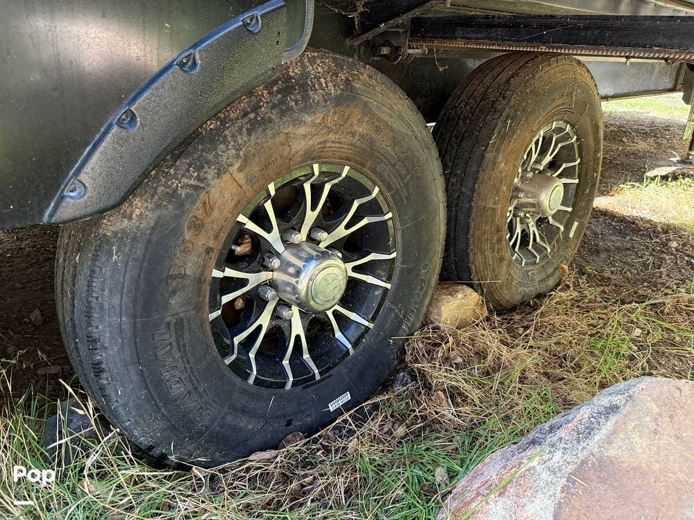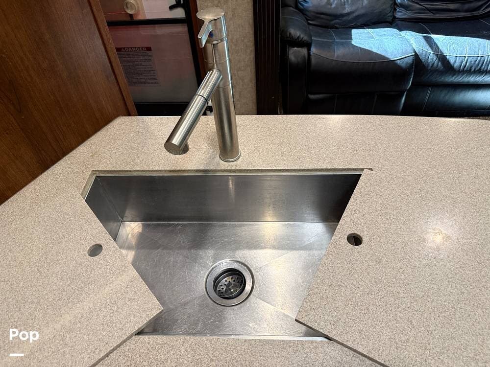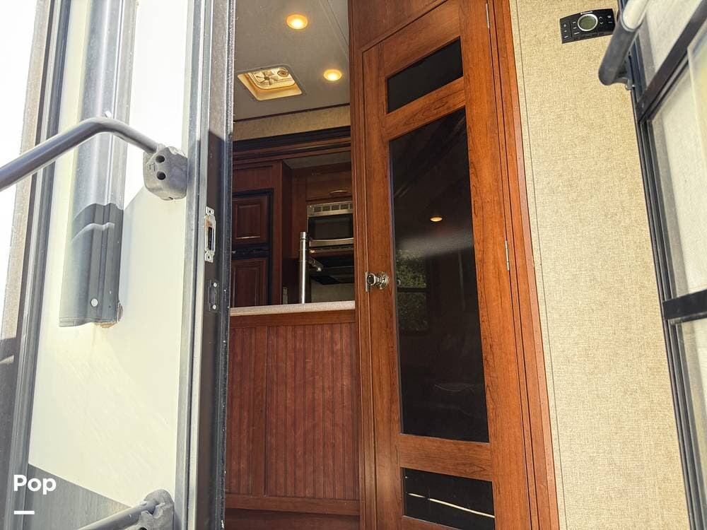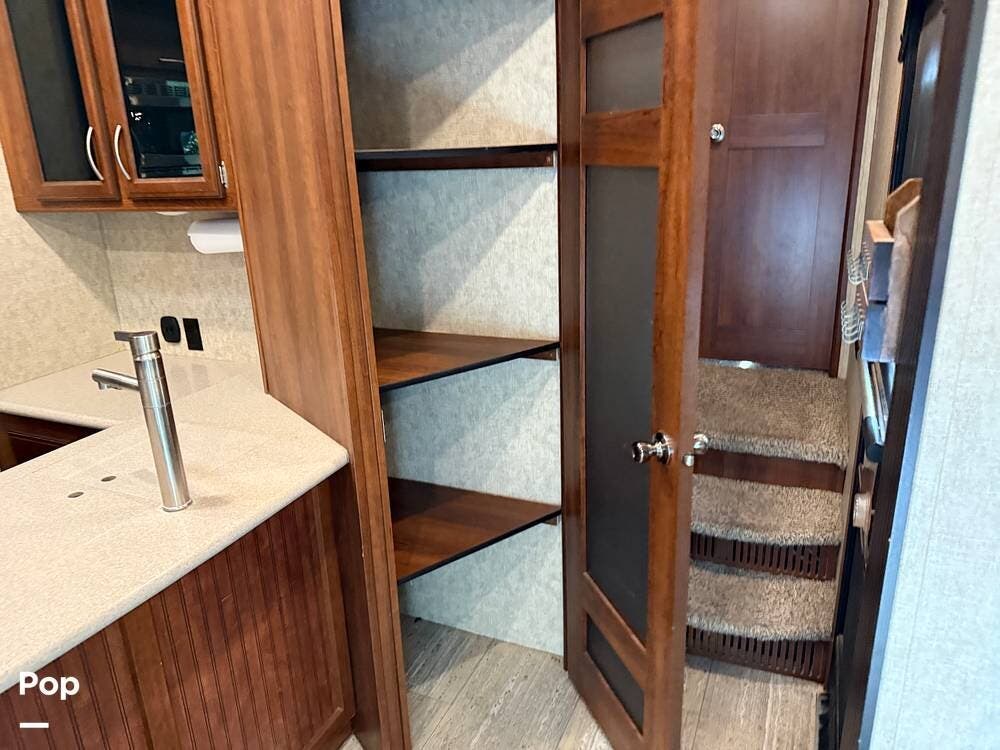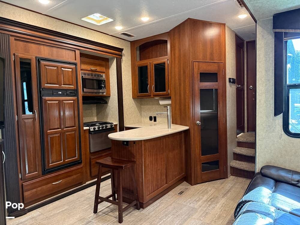 The garage is functional to haul your toys and has a 30-gallon auxiliary fuel station. The garage area also hosts another living area with sofa seating, a table, a twin bed loft, and a second bathroom.