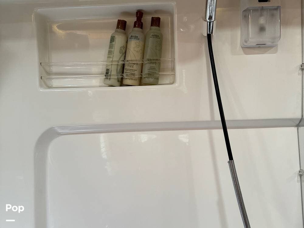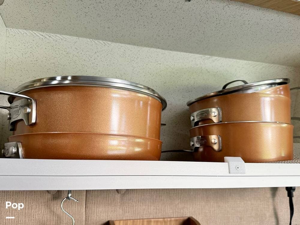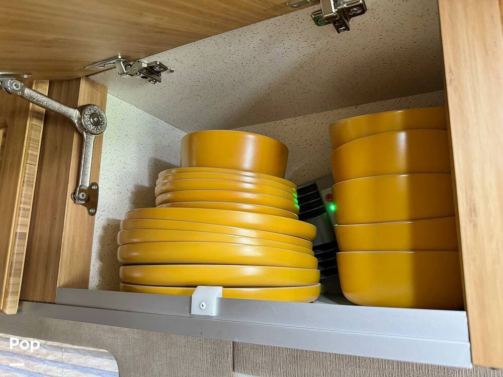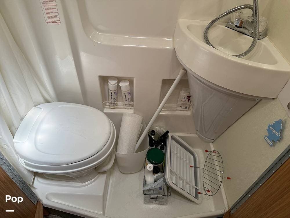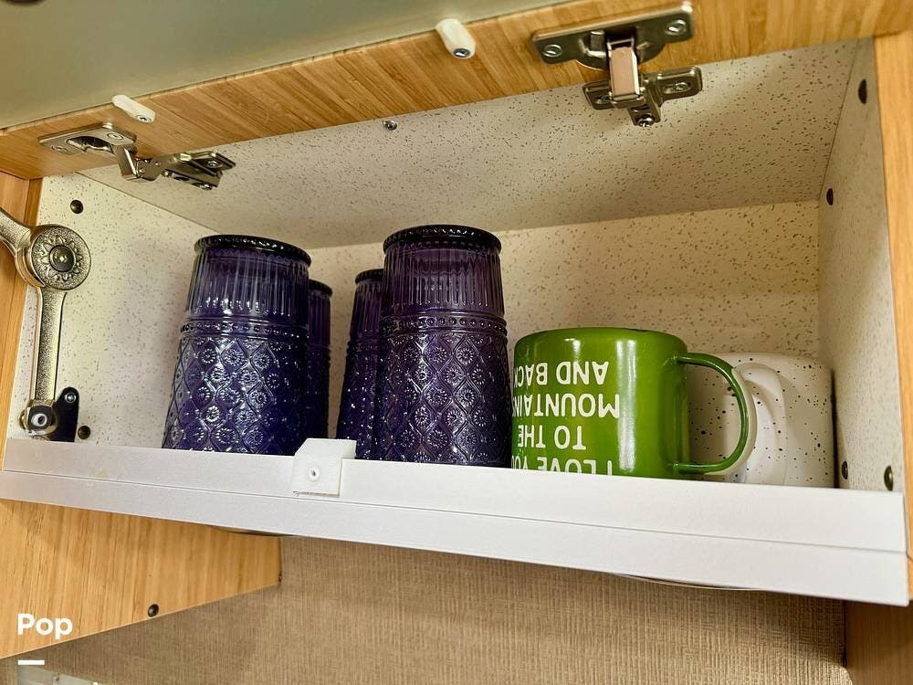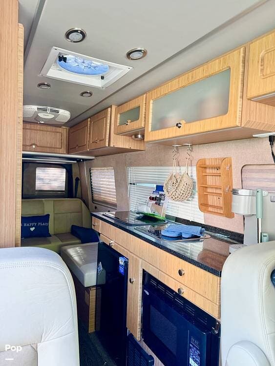 This Roadtrek has a fully equipped kitchen with a two-burner stove, refrigerator, and microwave, as well as ample cabinetry for storage. The bathroom is compact yet efficient, with a toilet, sink, and shower integrated into the layout