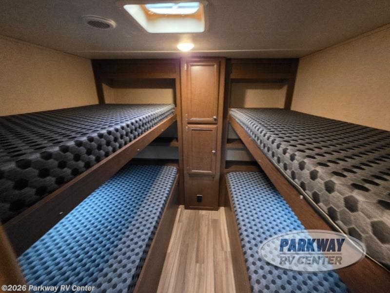 The rear bunk house is ideal for your kids. There are two sets of bunk beds. One set is 28" x 74" while the other set is slightly wider at 38" x 74". Between the bunks and along the rear wall you will find extra storage with a center closet, plus so much more.