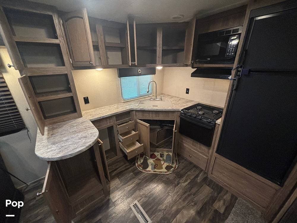 The 2017 Revere 29RK by Shasta features a spacious rear kitchen layout that is both comfortable and functional.