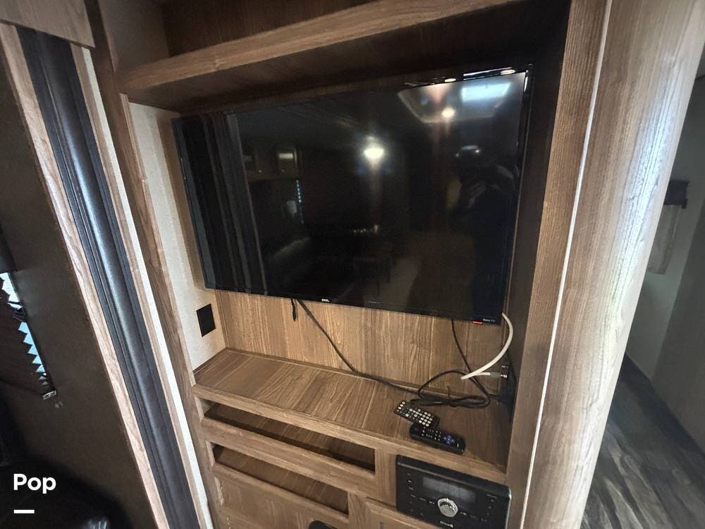 The entertainment center sits mid-ship, creating a natural division between the living area and the front sleeping quarters.