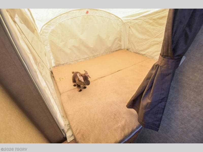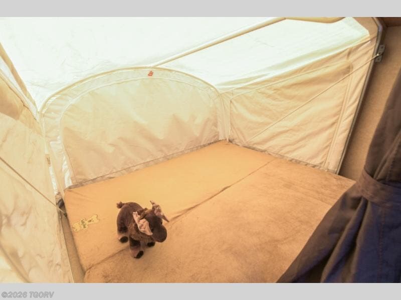 This unit comfortably sleeps up to 5 people. It features a fold-out rear queen bed and a spacious booth dinette that easily converts into a second sleeping area. The hybrid design offers the fresh air feel of a tent with the security and amenities of a hard-sided RV.