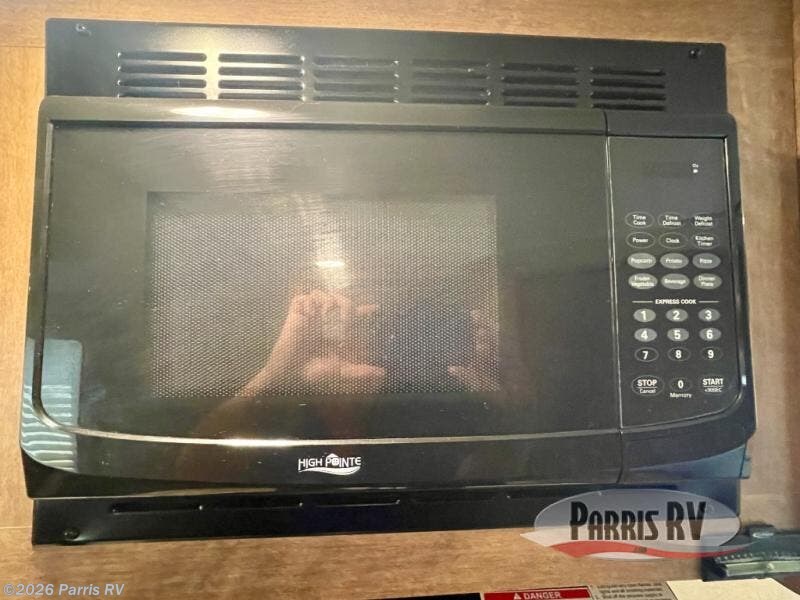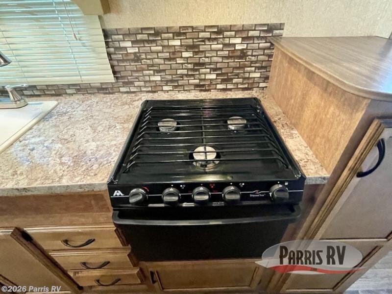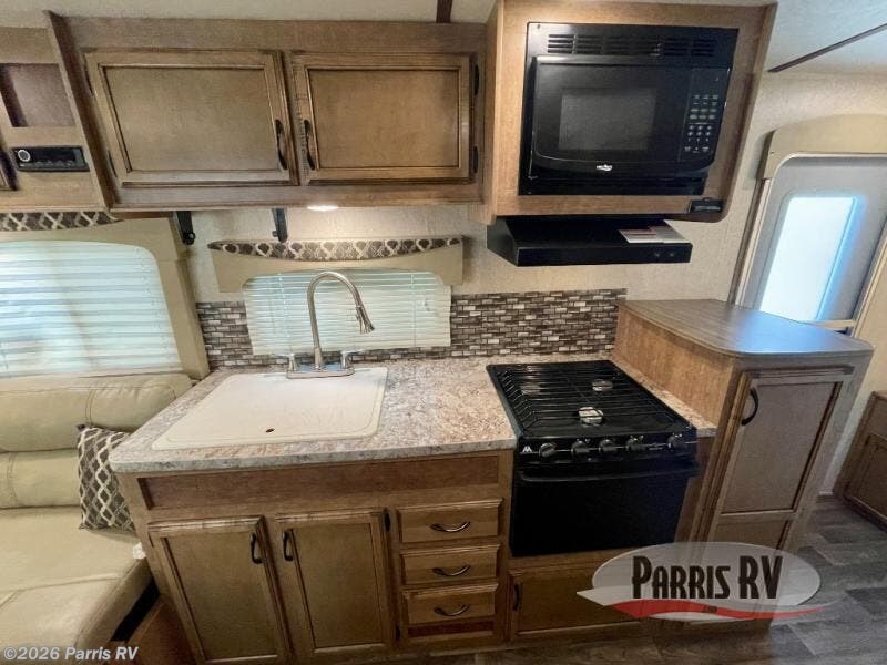 Enjoy cooking light meals and snacks in this Travel Star kitchen which features a pantry for storage, a three burner range with microwave above, and a large sink with overhead cabinet on the door side. Across the unit you will find a refrigerator to keep your perishables cold and fresh.