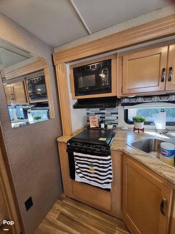 Stepping inside, you're greeted by a spacious, open floor plan that efficiently utilizes its 28-foot length. The living area features a cozy slide-out that expands the space, creating room for a booth-style dinette. Large windows flood the interior with natural light, enhancing the welcoming atmosphere.