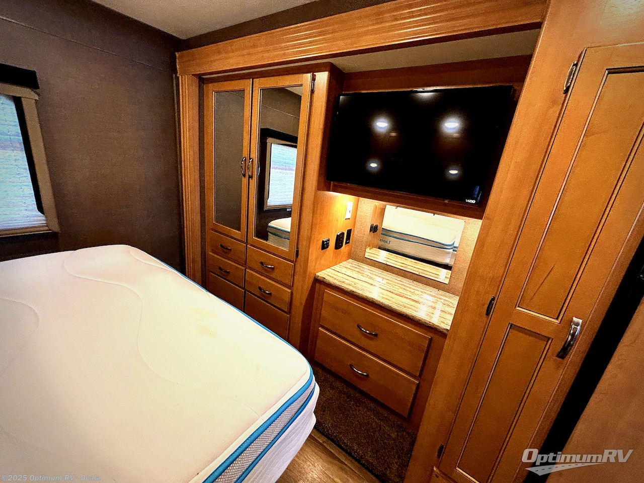 Moving into the bedroom area, still within the full wall slide out, there is a dresser and closet with a 32" LED TV. The bedroom also includes a queen bed with nightstands on each side plus overhead cabinets.