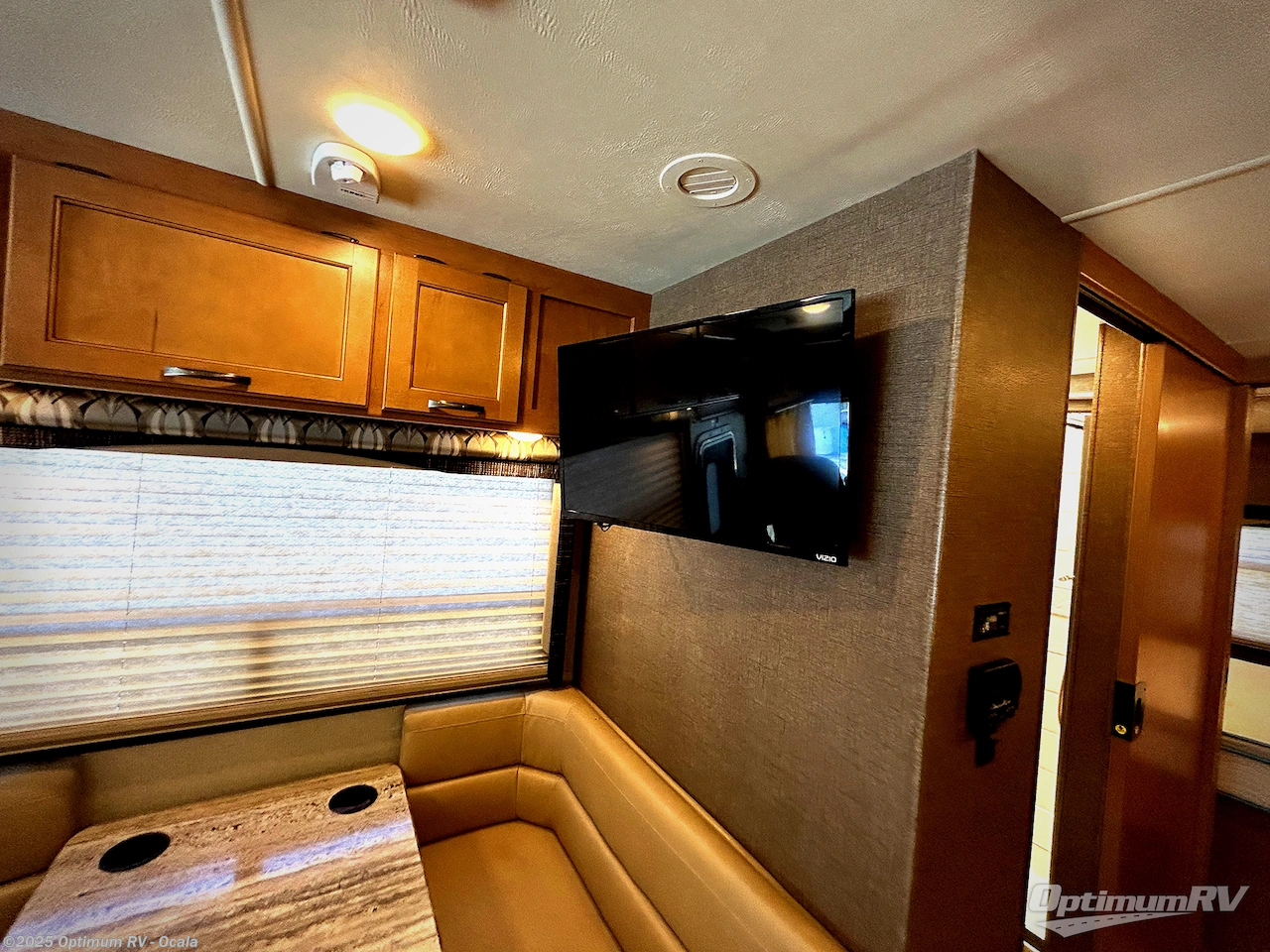 A spacious booth dinette has a 32" LED TV mounted above it, facing the front of the motorhome for easy viewing from all seats, including the captain's chairs.