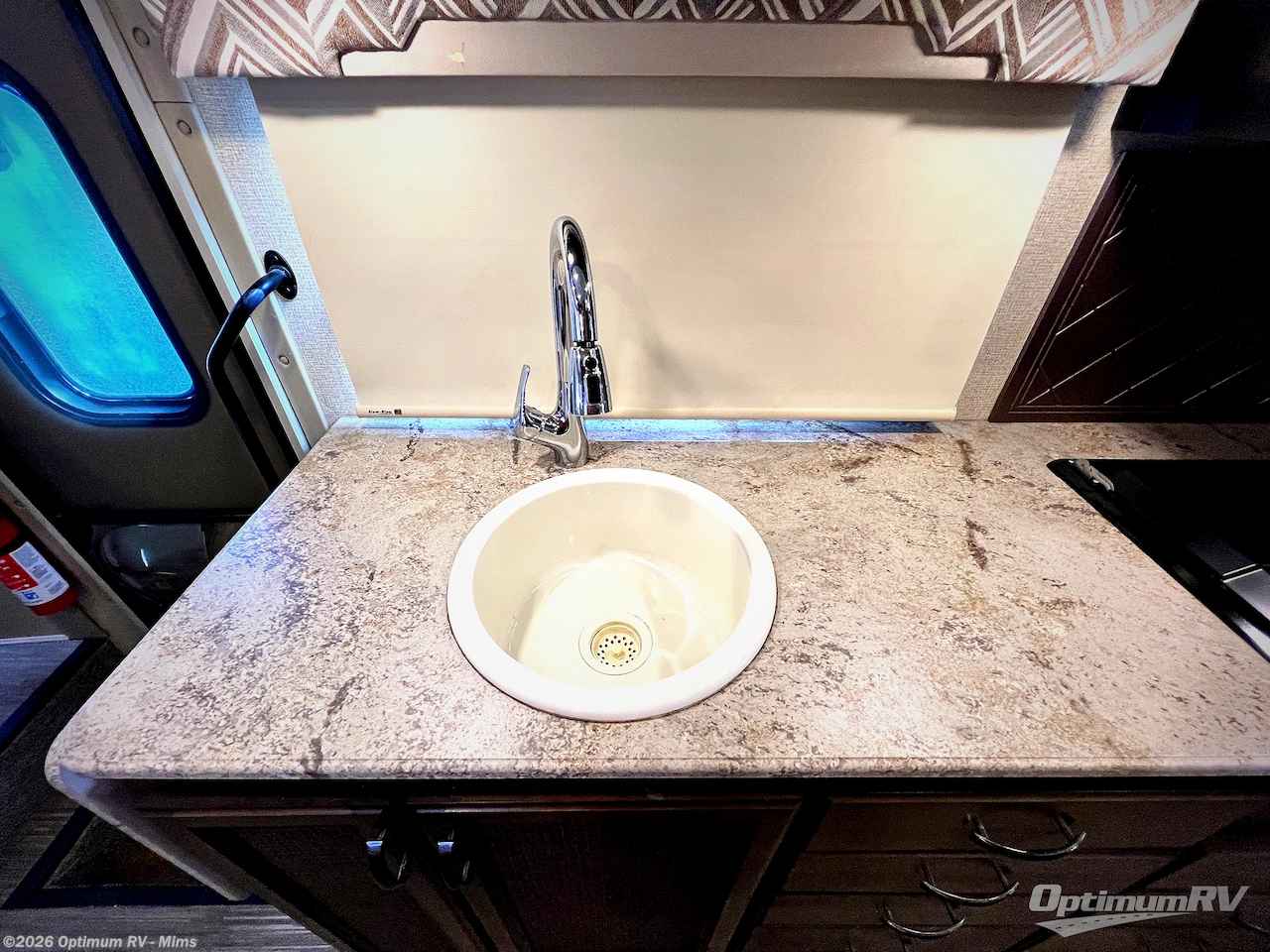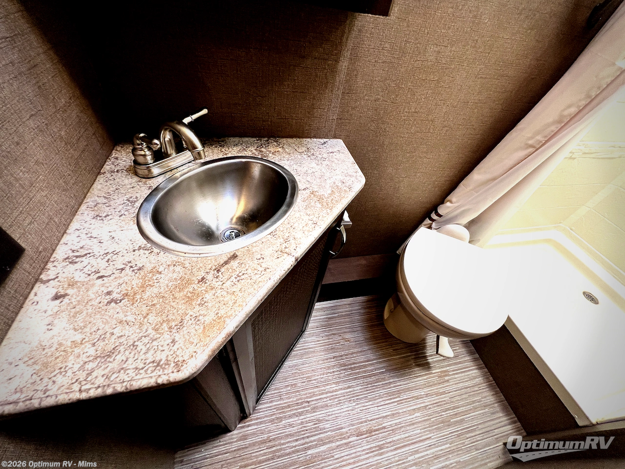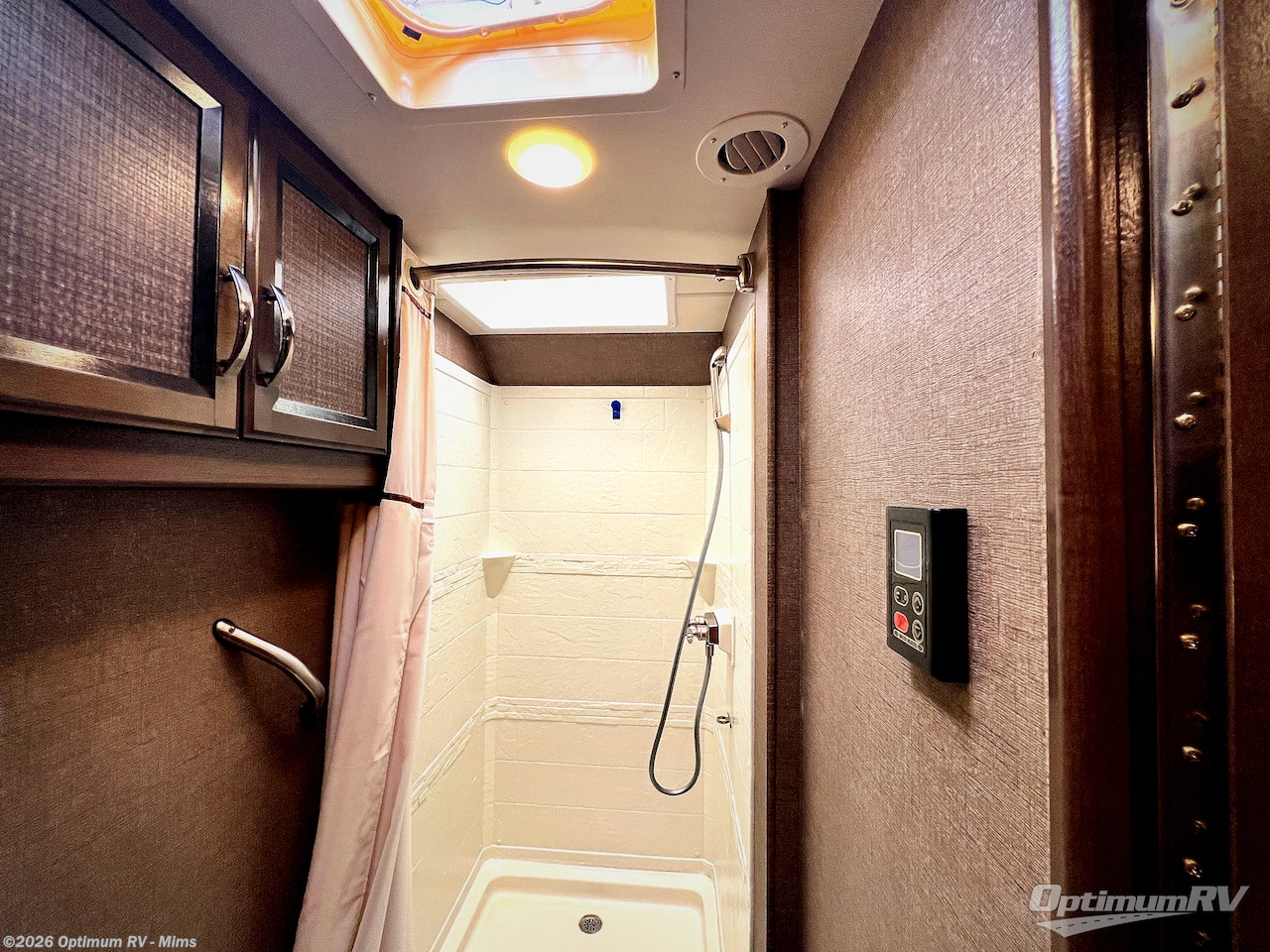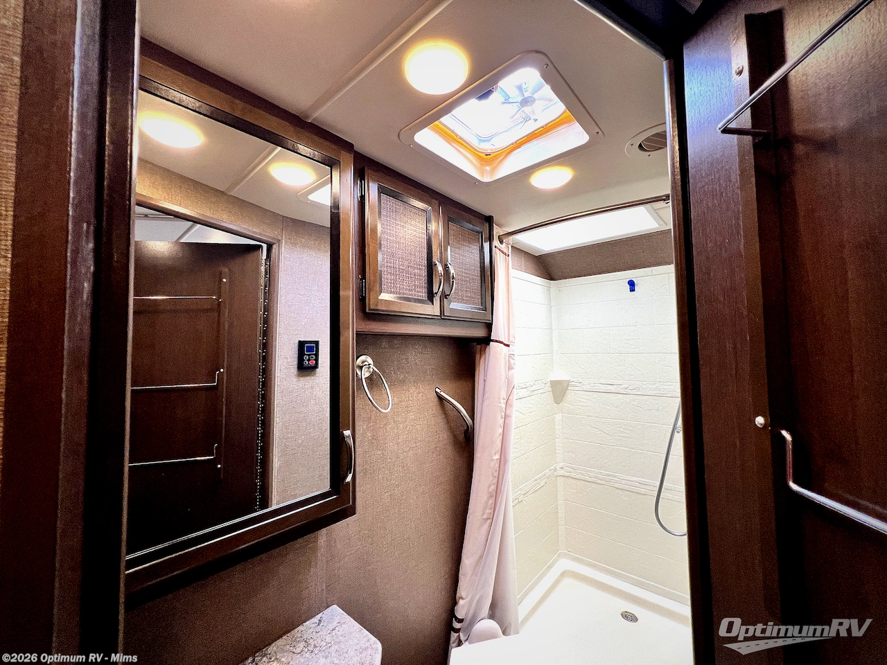 A rear private corner bathroom includes a shower, a toilet, a sink, and overhead cabinets. You will love the convenience of your own on board bath!