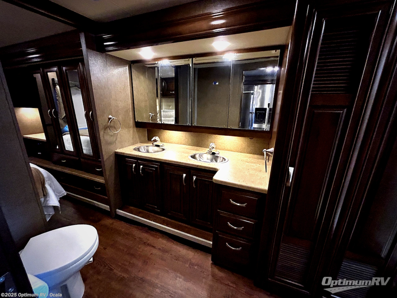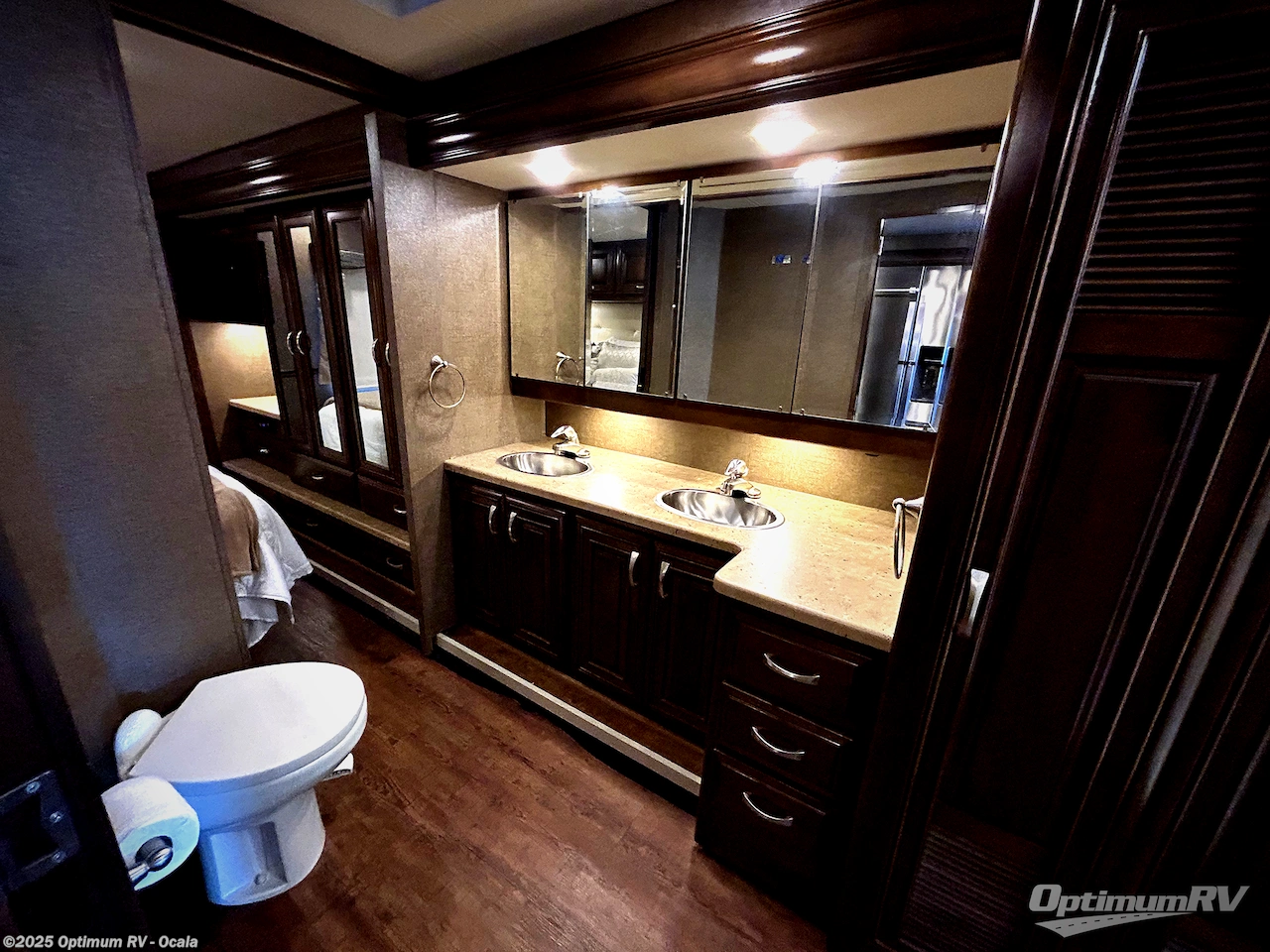 Mid-coach find a large side bath centrally located along the road side. The bath features a 36" x 30" shower, a toilet, and a vanity with dual sinks, plus a closet that has been prepped for a stackable washer and dryer, if you choose to add that. Both of the sink and the closet are within the third slide out.