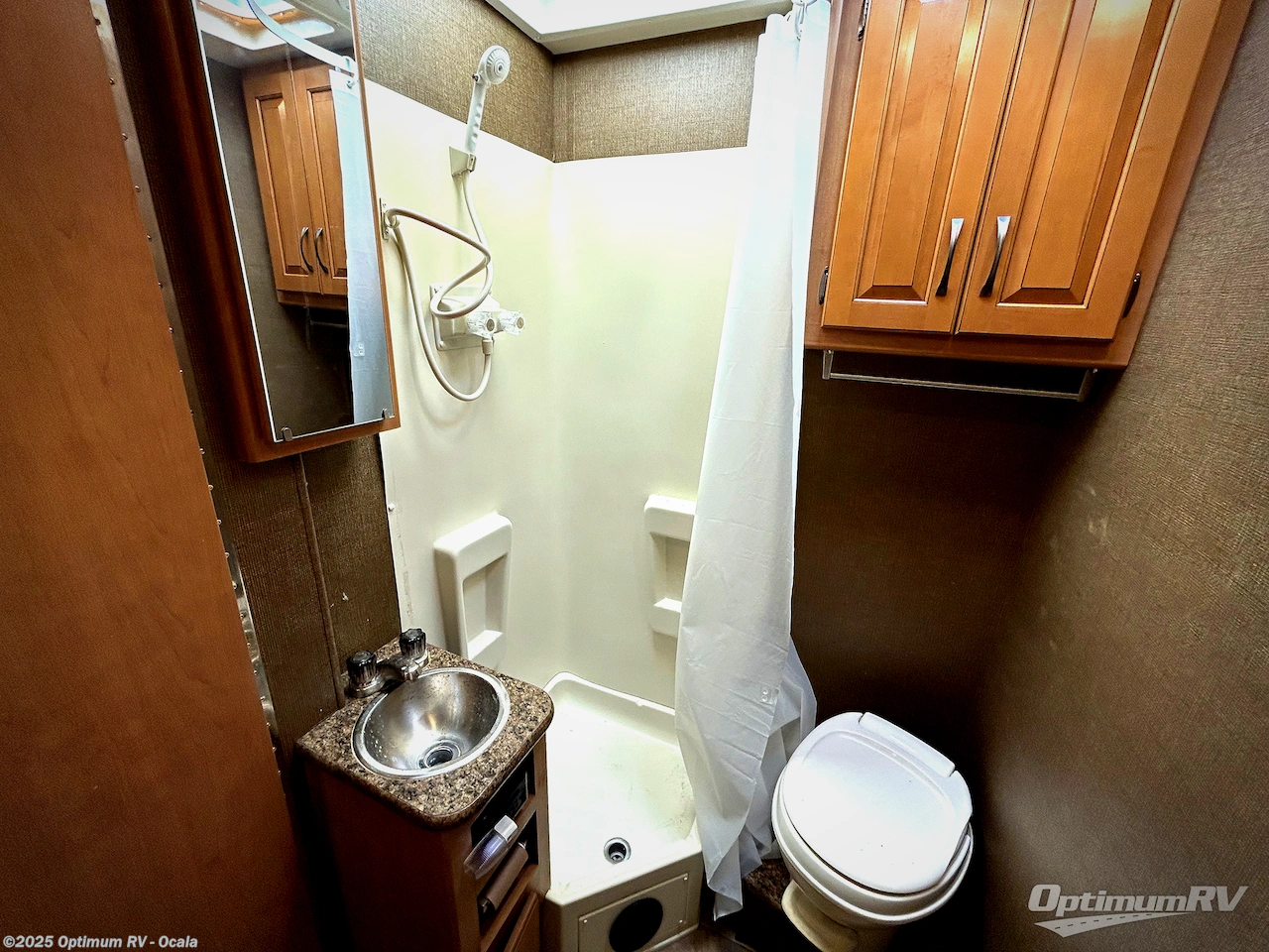 Continue on toward the rear and find a bathroom along the road side that provides a 27" x 27" shower, toilet, and small sink. Opposite the bathroom next to the refrigerator is a closet for your clothing and/or linens.