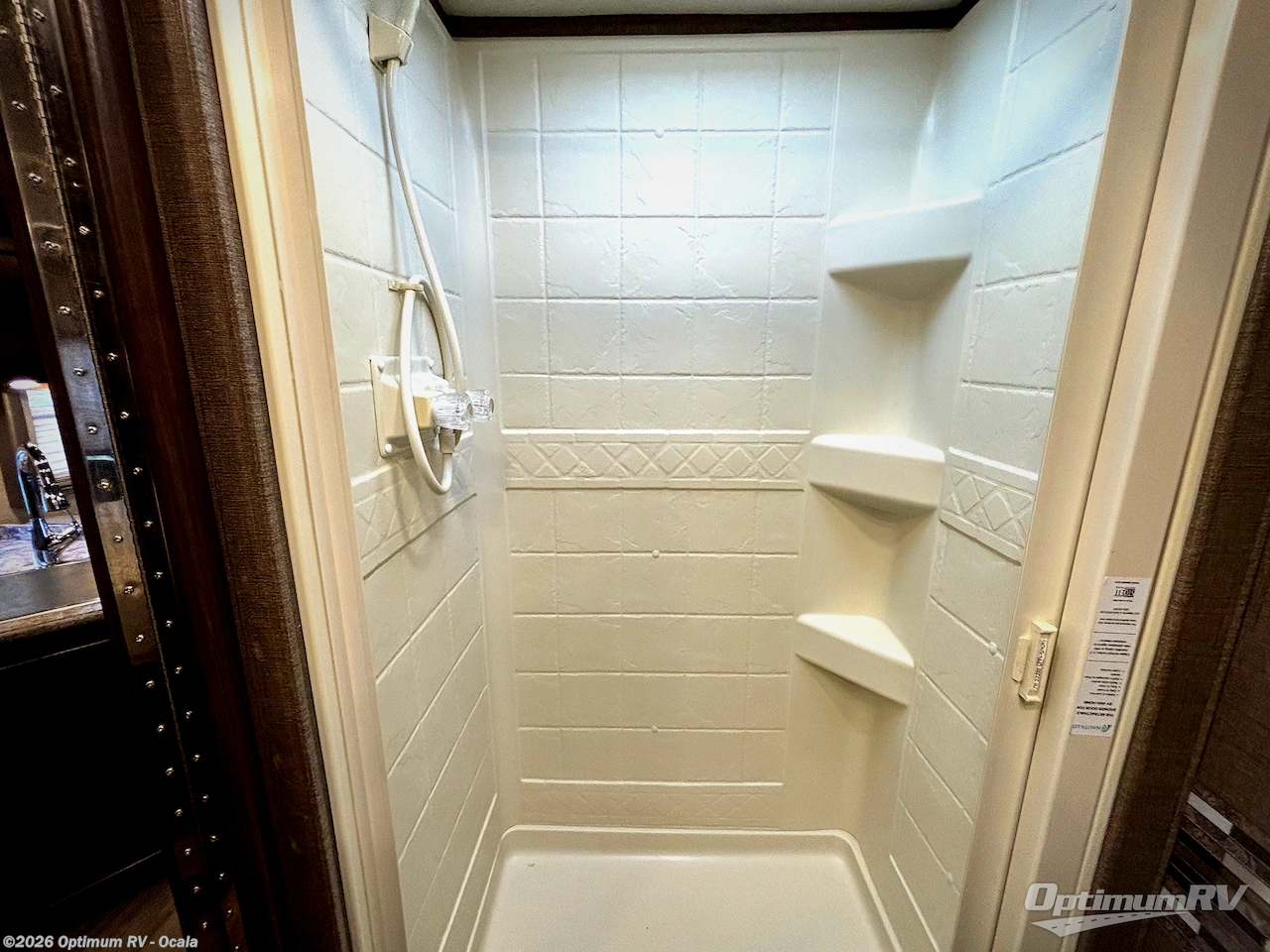 Heading toward the rear of this model, the side aisle bathroom is along the left side. Here there is a sink, plenty of counter space, an overhead cabinet, toilet, and a 24" x 36" shower.