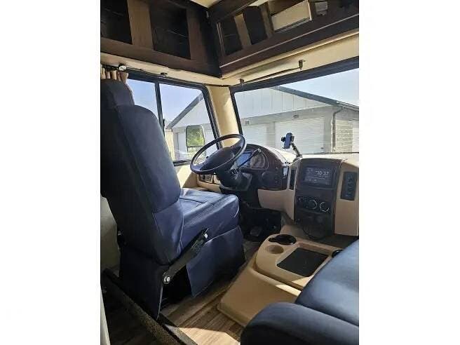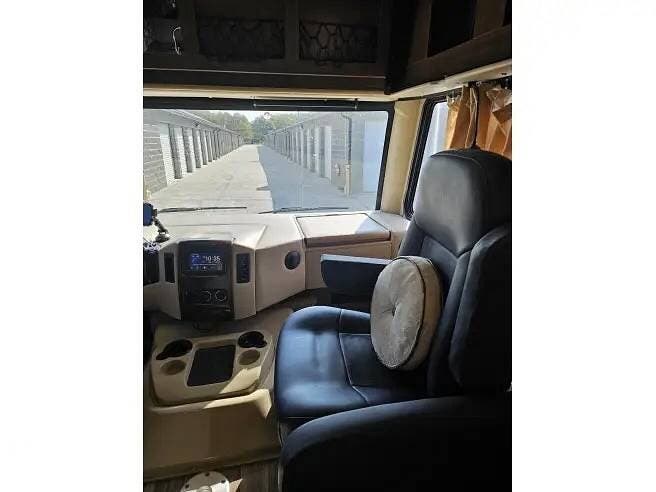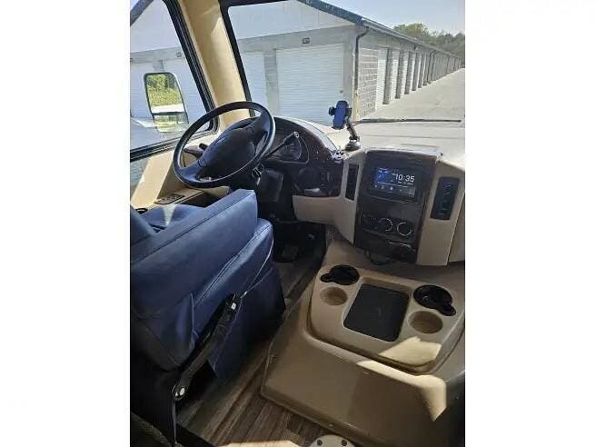 As you enter this coach, you will find a spacious driver's area equipped with a touchscreen AM/FM with a CD Player, as well as a backup monitor and mirror display. Heated remote exterior mirrors with side view cameras, reclining swivel leatherette captains chairs, and a stow-away coffee table.As well as a 46" x 74" overhead bunk.