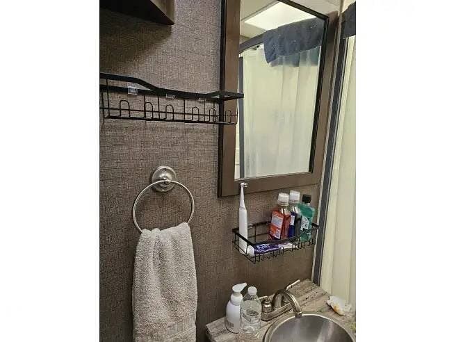 In the rear of the coach, separated by a privacy door, you will find a 72" x 76" king-sized bed that slides out to give plenty of room to move around, a wall-mounted 32" LCD smart TV, a full bath with a 24" x 36" stand-up shower, and a nice-sized closet.