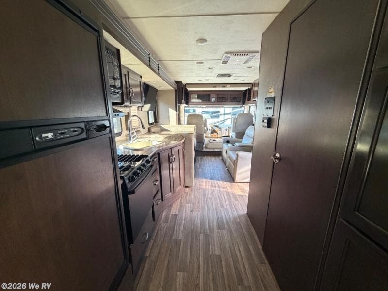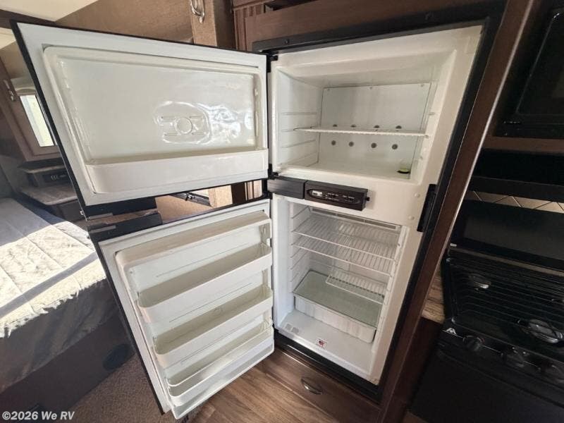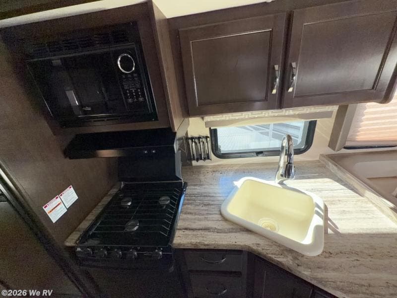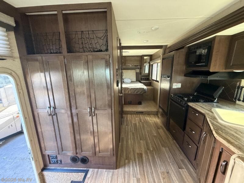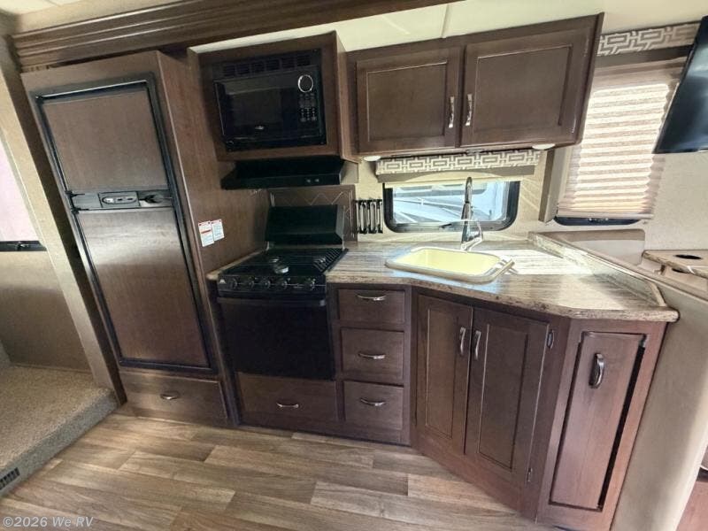 Step inside and notice the convenient broom closet coming up the steps. Enjoy all of the interior space you find when the large driver side slide out is fully extended. There is a jack-knife sofa to your immediate right through the entry door. Along the opposite side you have a slide out booth dinette with a 40" LED TV mounted above it, a pull-out pantry, and kitchen sink, plus overhead cabinets. There is also a three burner range with overhead microwave oven, and refrigerator for all of your food prep and cooking needs.
