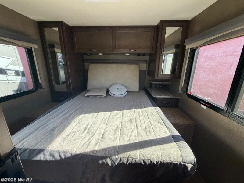 The rear features a queen bed with closets on either side of the bed. In the corner of the room you can enjoy the 24" LED TV. There is also more sleeping available on the drop-down overhead bunk above the cab area up front.