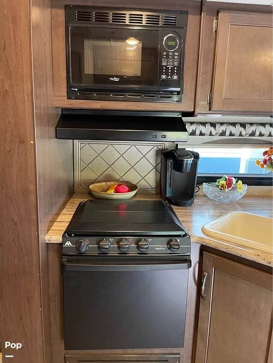 The modern kitchen is equipped with solid-surface countertops, a three-burner stove, and a large double-door refrigerator, ensuring you're always ready for a home-cooked meal on the go.