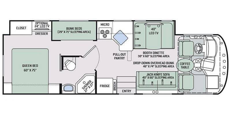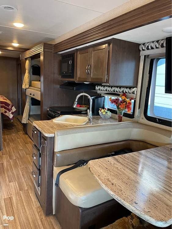 Discover a beautifully designed interior with plenty of room for family and friends. The full-wall slide expands to reveal a generous living space featuring a dream dinette sleeper, bunk beds, a cozy sofa bed, and a drop-down overhead bunk for sleeping up to 10!