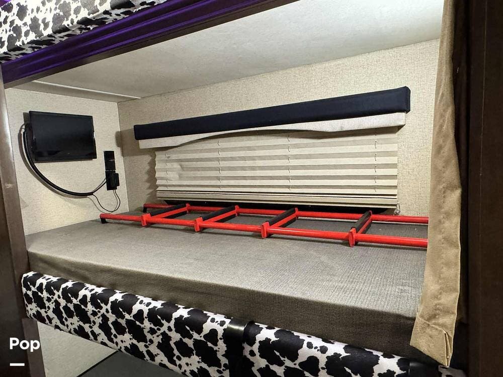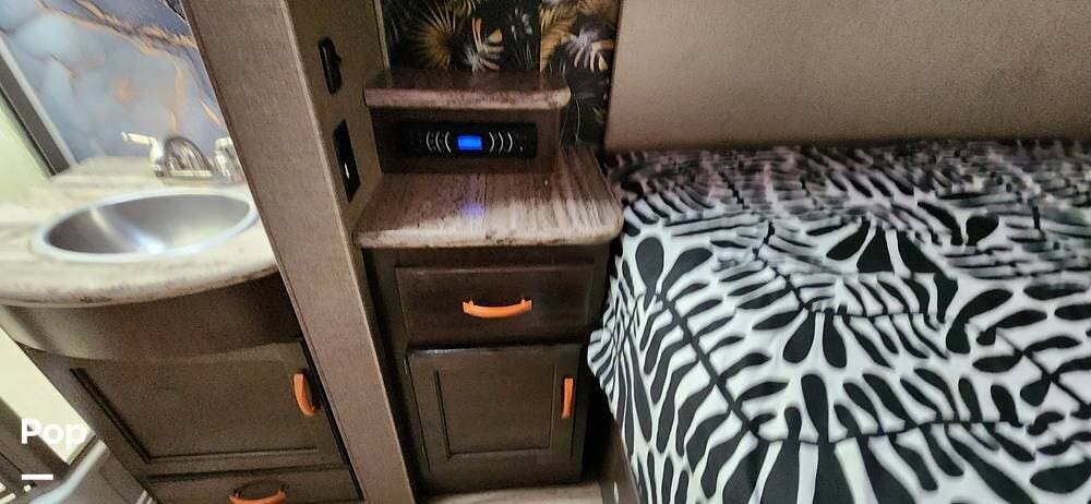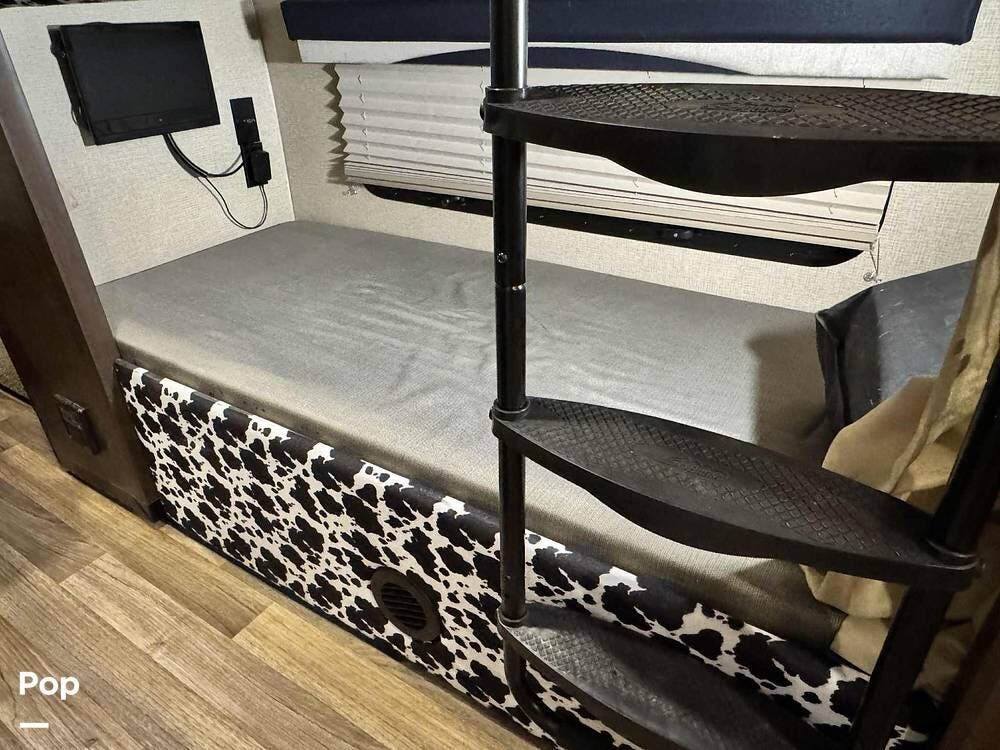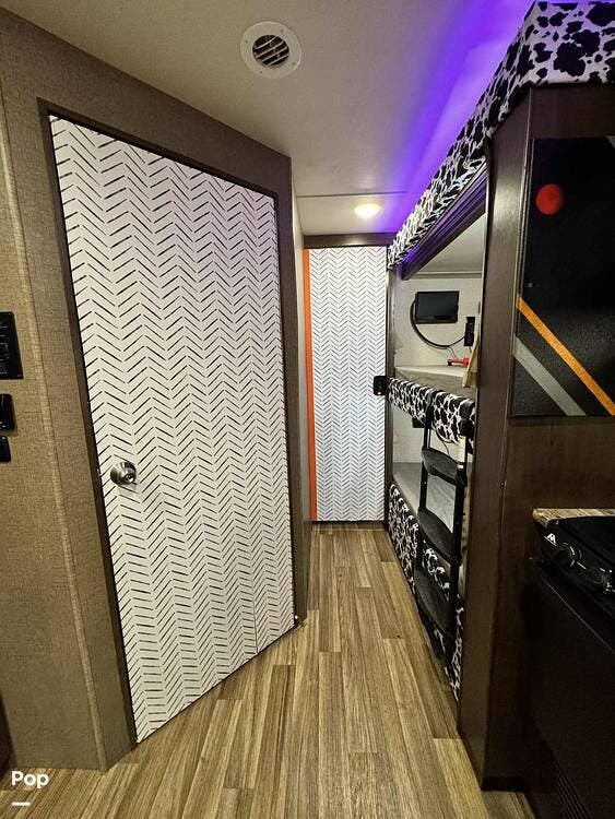 Inside, the big slide opens up the whole living area, so it doesn't feel tight. There's a jackknife sofa, a dinette that turns into a bed, and that drop-down overhead bunk that's great for extra sleepers. The bunk beds in the hallway make it feel even more like a "bring-everybody-along" kind of coach. The bedroom in the back has a comfy queen bed and decent closet space.