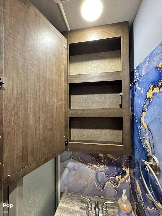 Outside, it's set up for chill campsite time, with a power awning and solid storage compartments for all the random gear that always ends up along for the ride. The leveling jacks make setup quick, and the built-in cameras help a ton with parking and backing up.