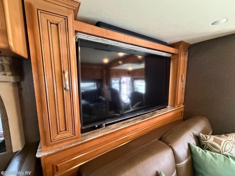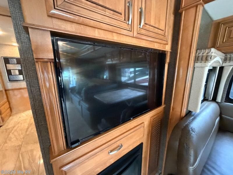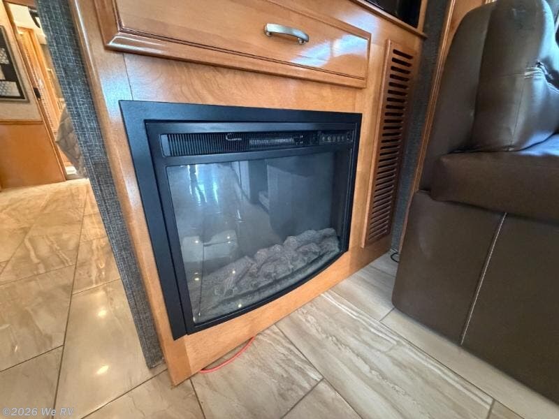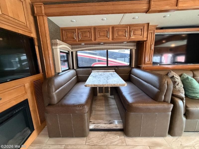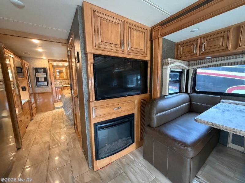 Along the road side wall you will find the first slide out featuring a sofa with air bed and dream dinette. Both have two sets of seat belts as well as provide extra sleeping areas at night. Plus there is a retractable 50" LED HDTV behind the sofa facing the theater seating on the opposite side. You may also watch the 43" LED HDTV along the interior wall next to the dinette as well as cozy up by the fireplace below.