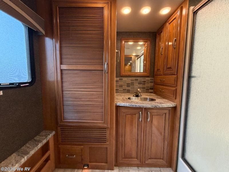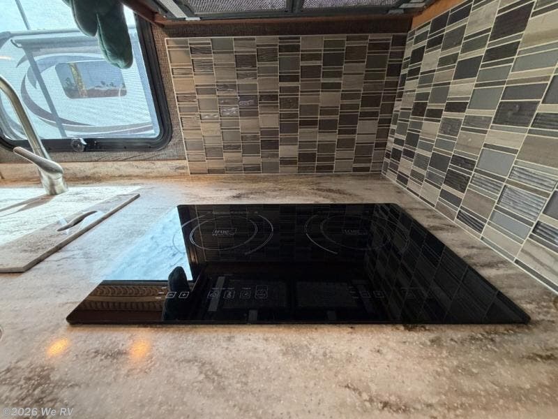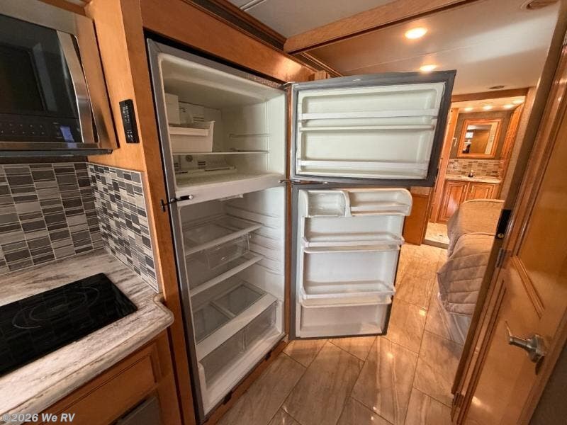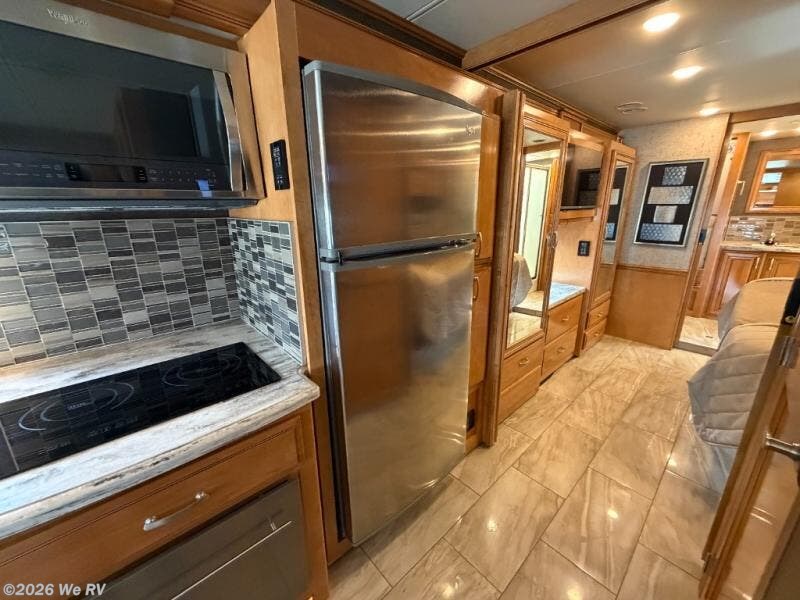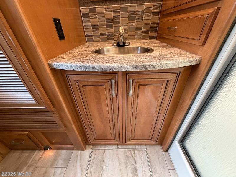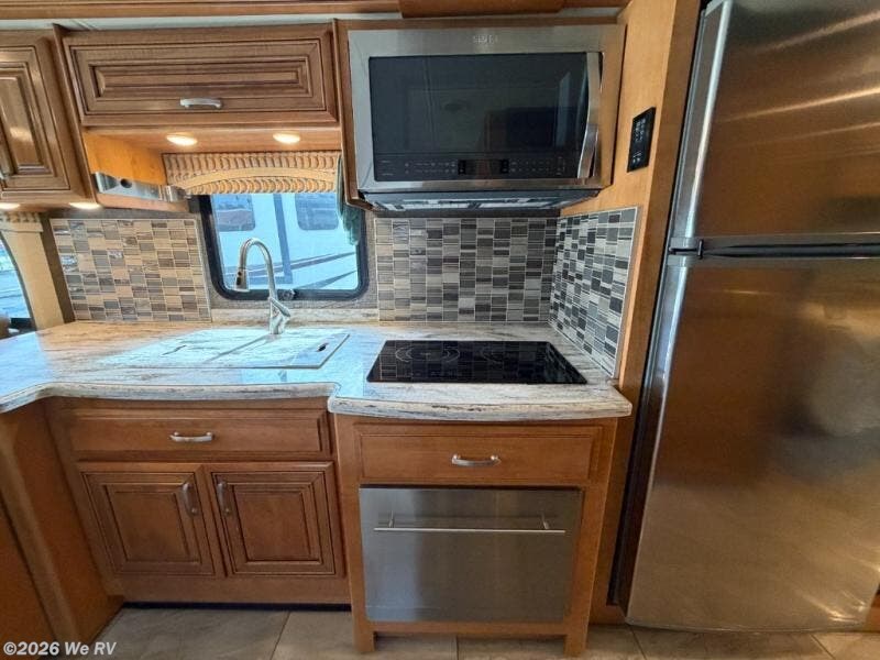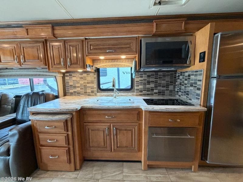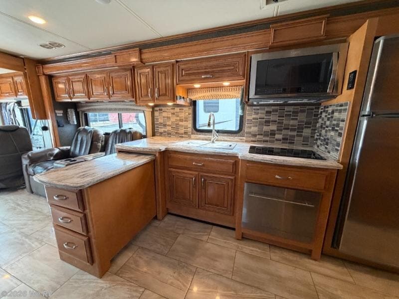 On the opposite side the second slide in the main living area ends in the bedroom. There are two reclining theater seats including two more seat belts for family and friends. You may choose an optional sofa bed if you like. The slide continues with the kitchen amenities. There is a pull-out cabinet, counter space, double kitchen sink, two burner induction cooktop, convection microwave oven, residential refrigerator, and a pantry for your non-perishables. Now that's a dream kitchen!