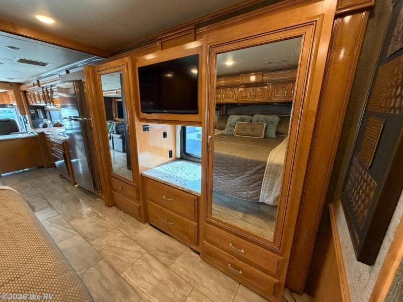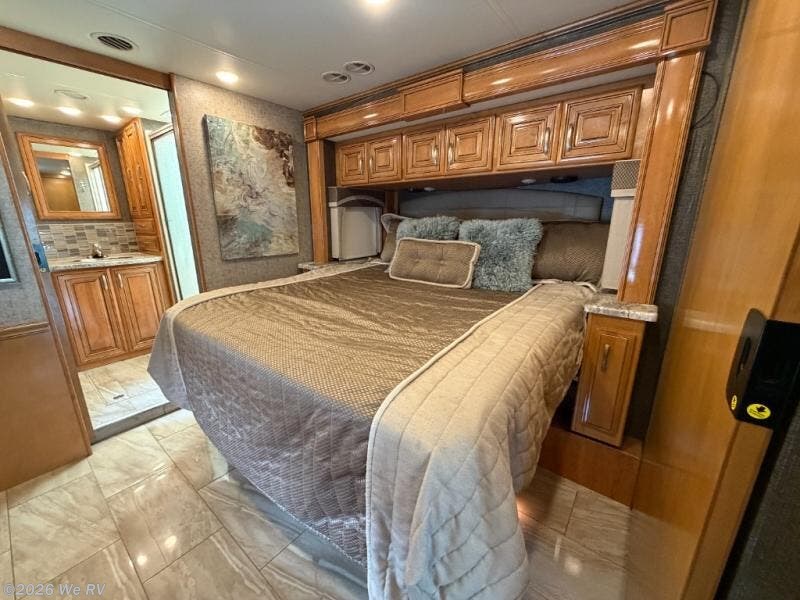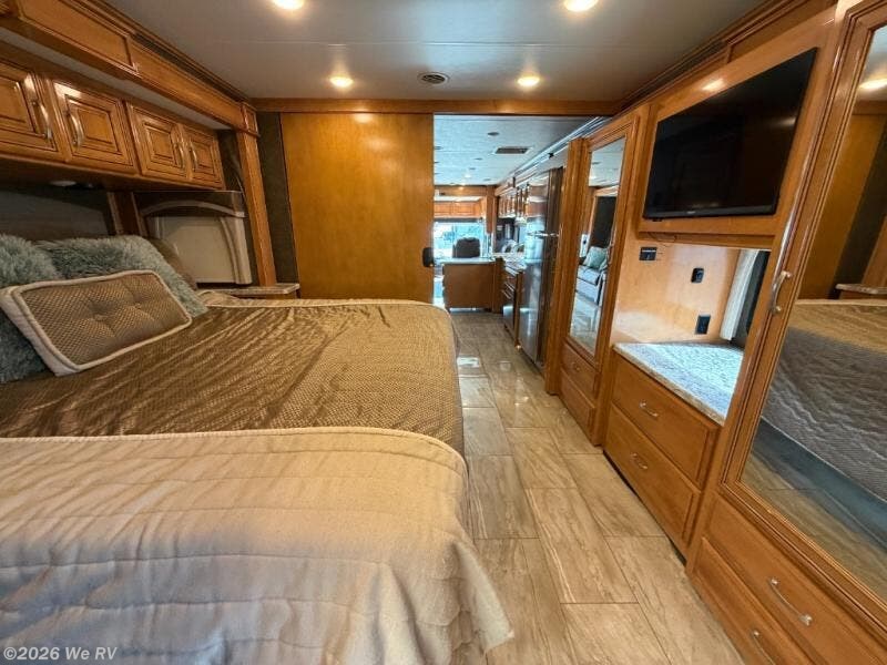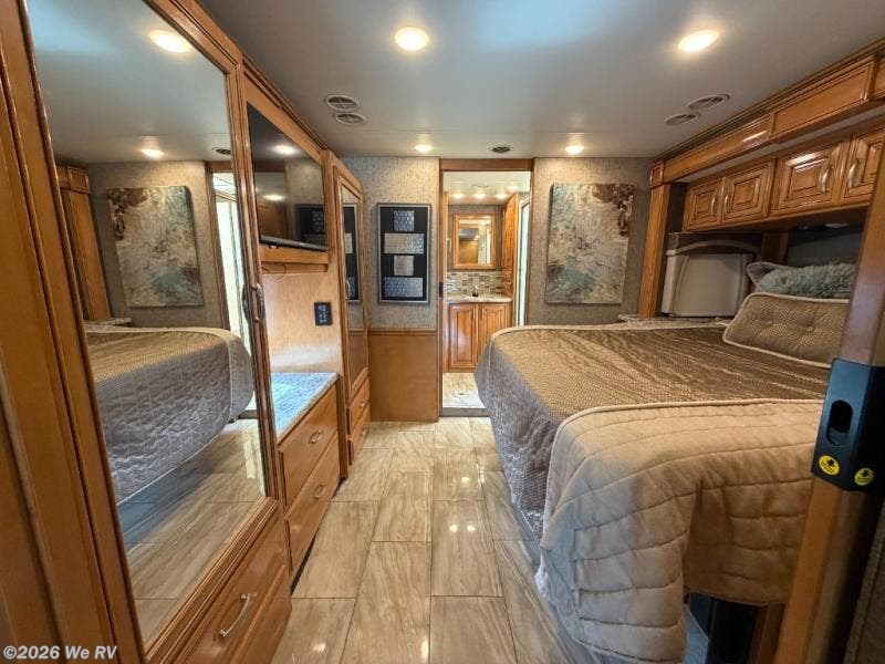 The walk-through master bedroom features two slides providing additional floor space. There is a king bed slide out with nightstands on one side, and two wardrobes, a dresser, and 32" LED HDTV inside the living room full wall slide out on the opposite side.